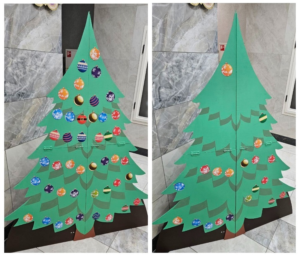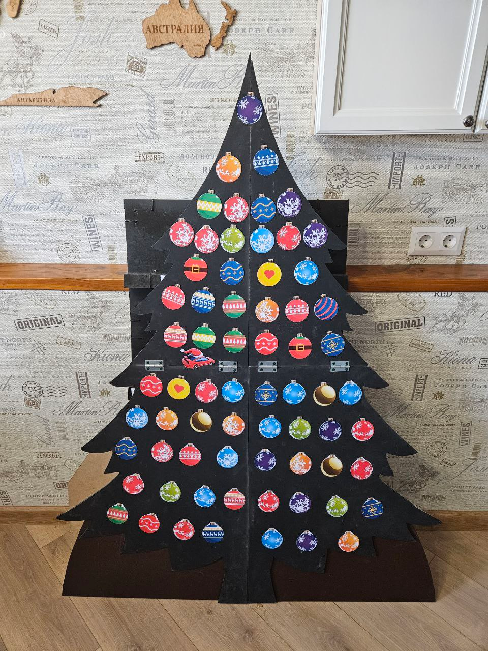 Соединяем детали между собой при помощи заклепок и шарниров. Внизу появляется основание, которое не позволит елочке завалиться на тонкой ножке. Ну и примеряем елочные игрушки/предсказания.