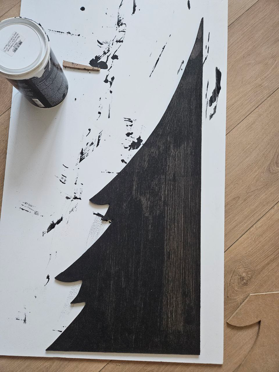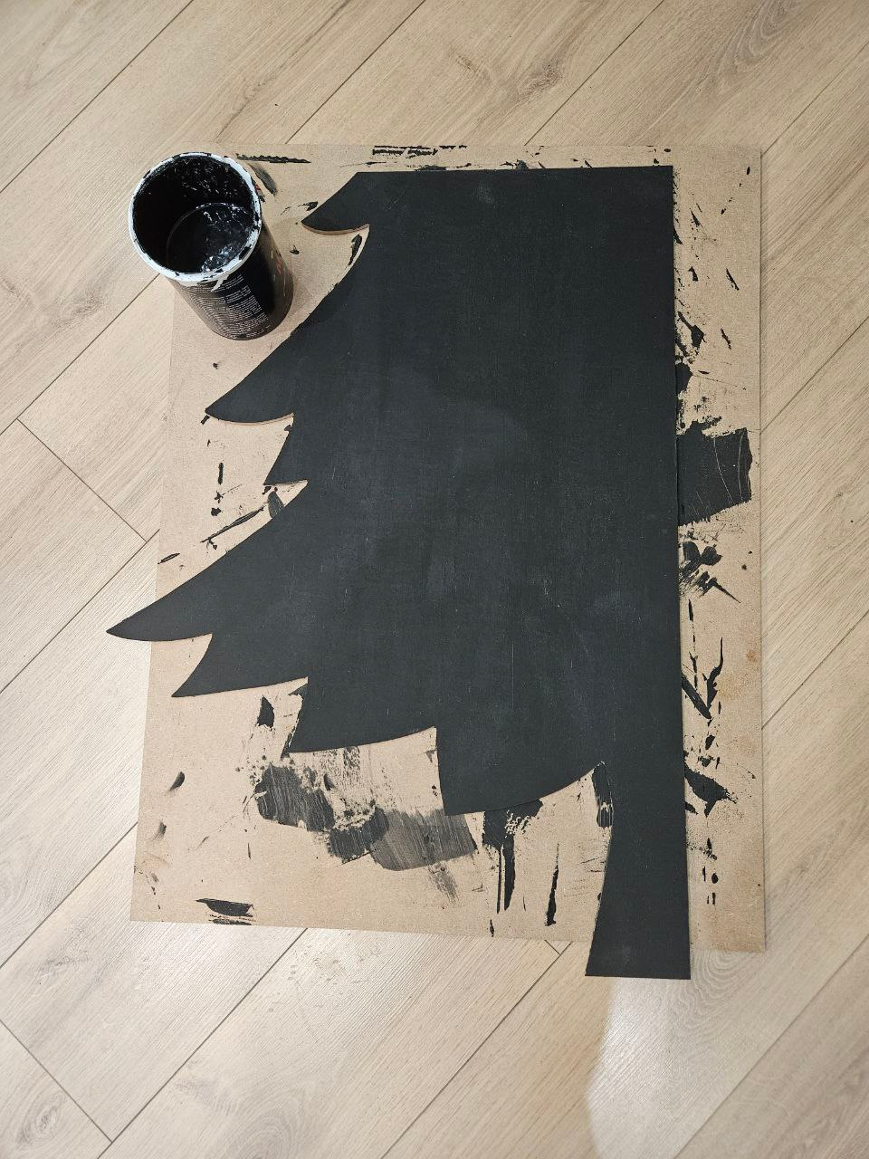 Следующий этап: покрытие магнитно-грифельной краской... черной. К сожалению, в других цветах ее не производят. (Может Баба-Яга против?... Елочка все-равно будет!!!) Наносить надо шпателем. Надписи на банке краски противоречат сами себе. Отличный пример работы маркетологов! Выбираем из всех надписей самый плохой для нас вариант и наносим краску с указанными перерывами.