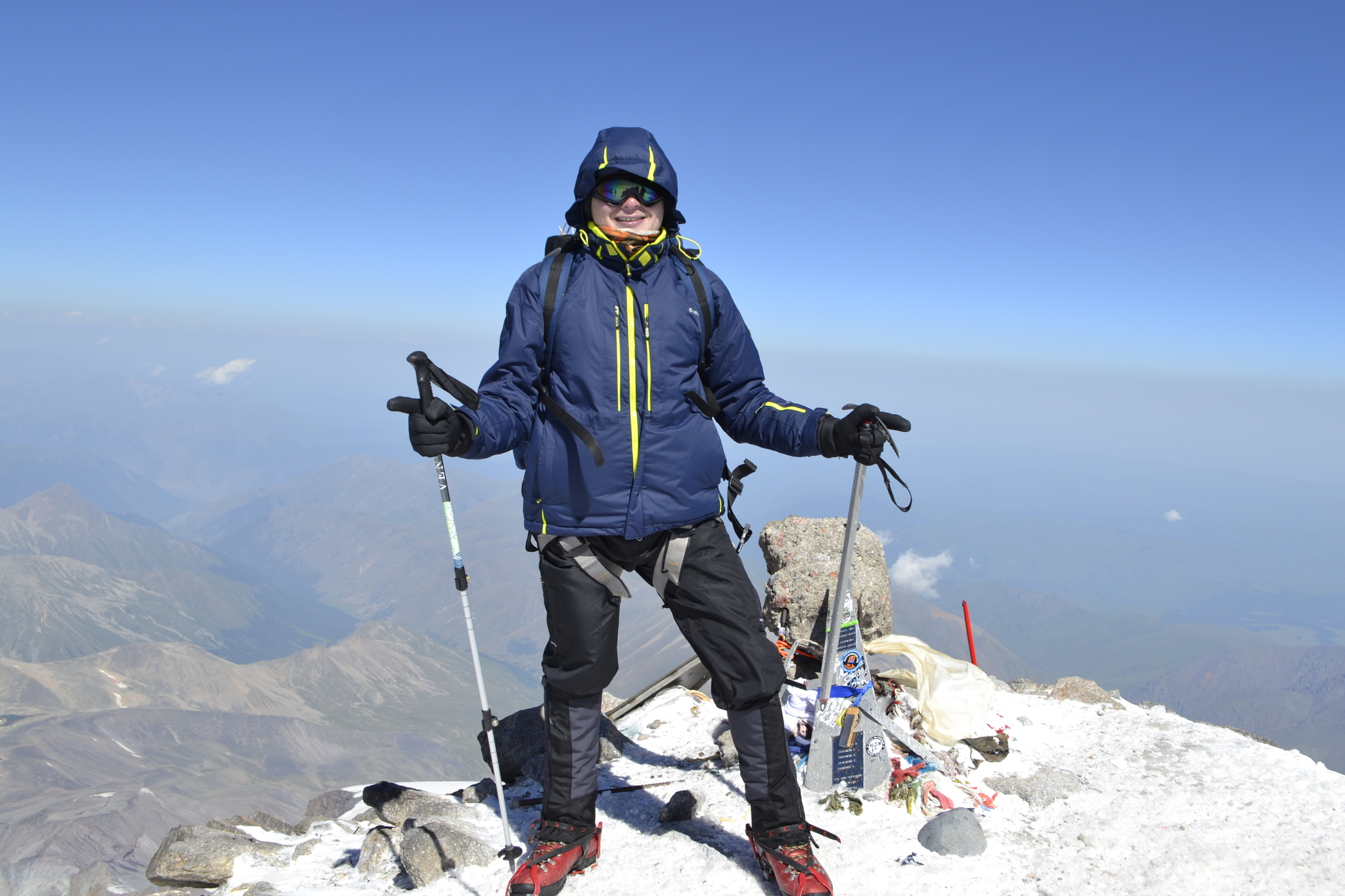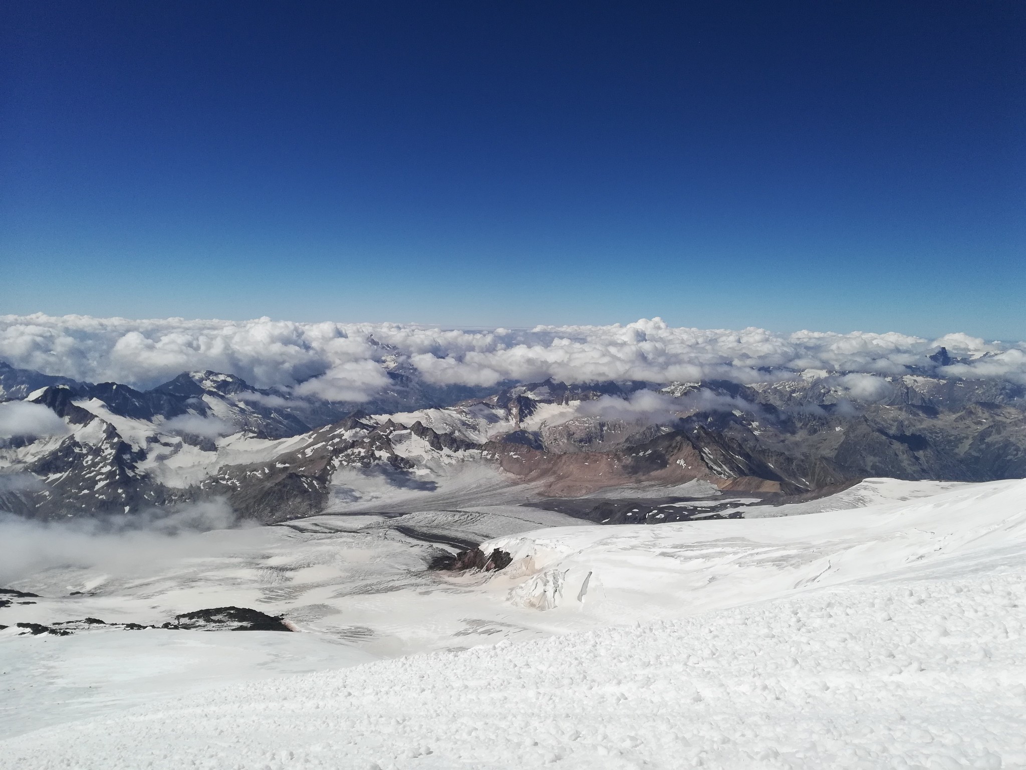 Вверх мы шли 10 часов, погода как будто извинялась за треккинг, нам светило солнце, а ветра по эльбрусовским меркам просто не было. 5100, косая полка, бесконечная зараза, седловина, и можно отдохнуть, все спят.. последний рывок, привал только на самостраховке с ледорубом, в 100 метрах от вершины я окуклилась и вырубилась, перестав реагировать на тычки палками от добрых друзей. Зато «соберись, тряпка» на меня подействовало, а потом все было как в мечте: вершина, облака под ногами, невероятная красота, друзья рядом, слезы счастья и чувство бесконечной благодарности всем, кто к этому был причастен. А тот, кто 6 лет назад стал причиной появления мечты, стоял рядом и победно грозил ледорубом безоблачному небу.