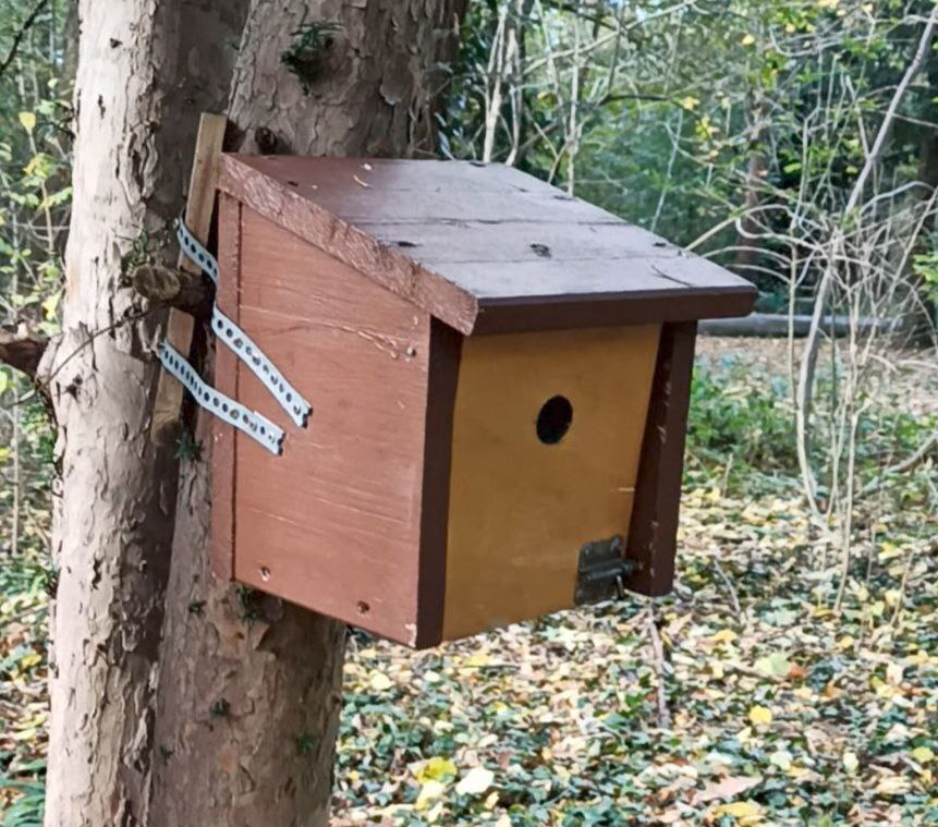 Ложный скворечник в парке, круглого отверстия нет, это просто краска.