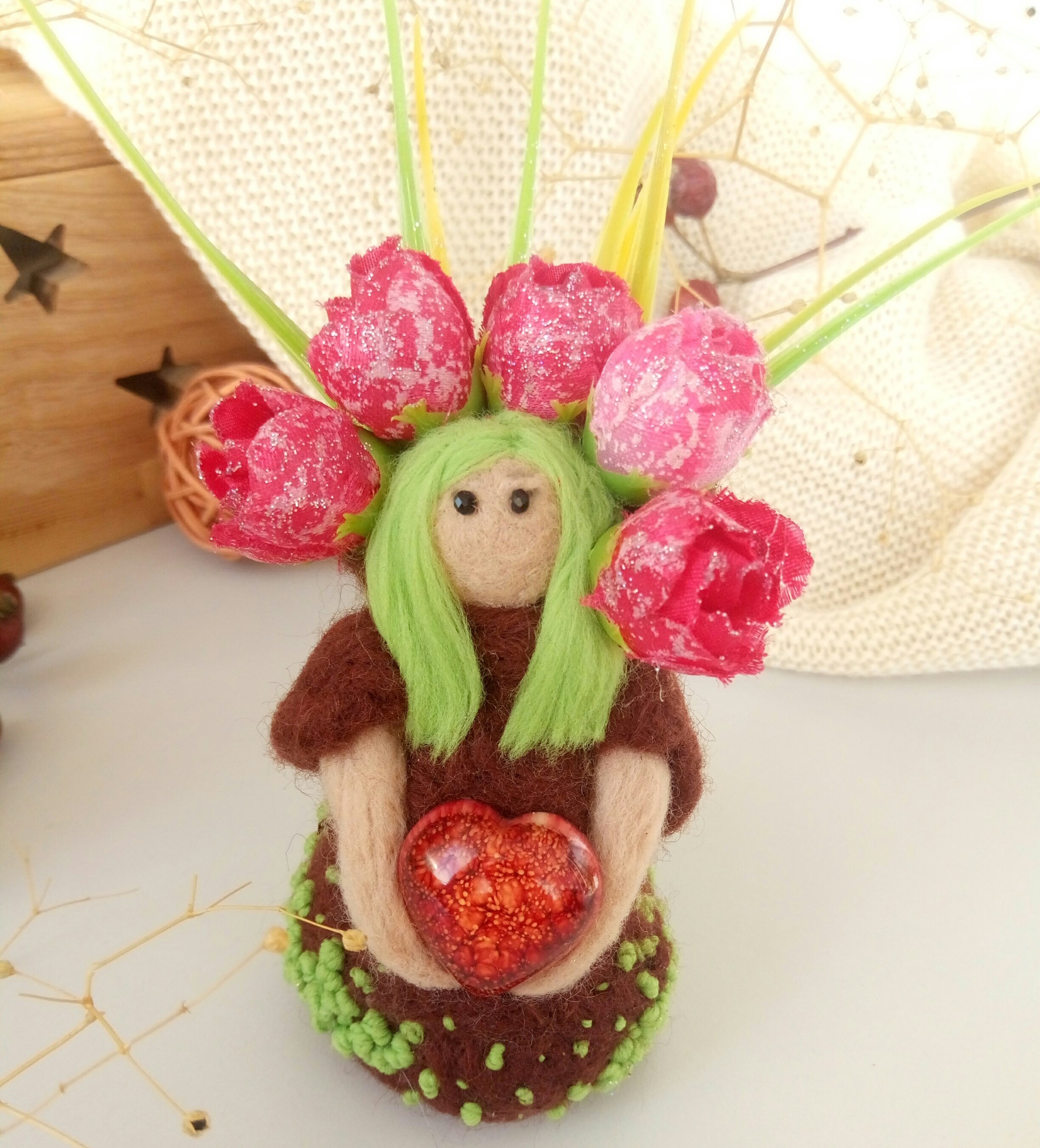 Вторая - вестница Весны. Тушка смесь мокрого и сухого валяния. Цветы и зелень так же искусственные, куплены в магазине. Сердечко акрил, приклеено. Простенькая вышивка в узелковой технике из акриловой пряжи. Из этой же пряжи сделаны волосы. Глазки бусины формы абакус (грани есть)