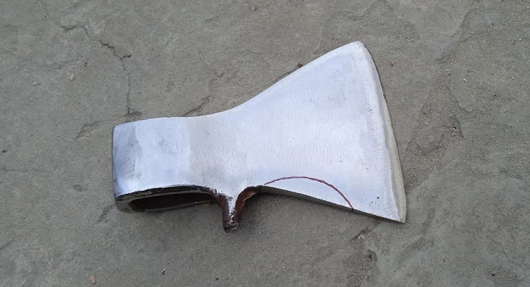После зачистки и грубой шлифовки мне подумалось, что было бы неплохо немного изменить форму топорика, подвергнуть рестайлингу, так сказать ). В нижней части полотна хотелось бы сделать вырез небольшой. Нарисовал его маркером: