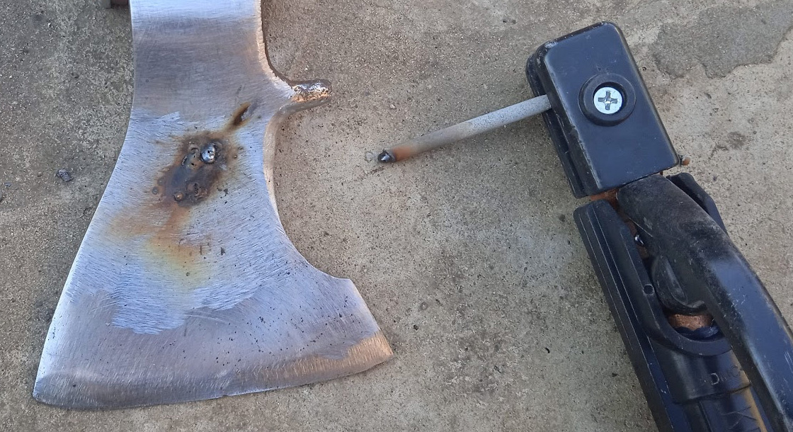 Ну и конечно же на таком топорике теперь просто обязан быть вытравлен узор, в каком-нибудь скандинавском или древнеславянском стиле. Уже даже есть в голове несколько вариантов. Но тут засада: глубоко выбитое клеймо с левой стороны топорика нарушит красоту узора. Значит, пришло время избавиться от этого клейма ). Сточить болгаркой - не вариант: останется слишком глубокая яма или впадина, это некрасиво. Тогда решил попробовать заварить, благо сварочный аппарат имеется.