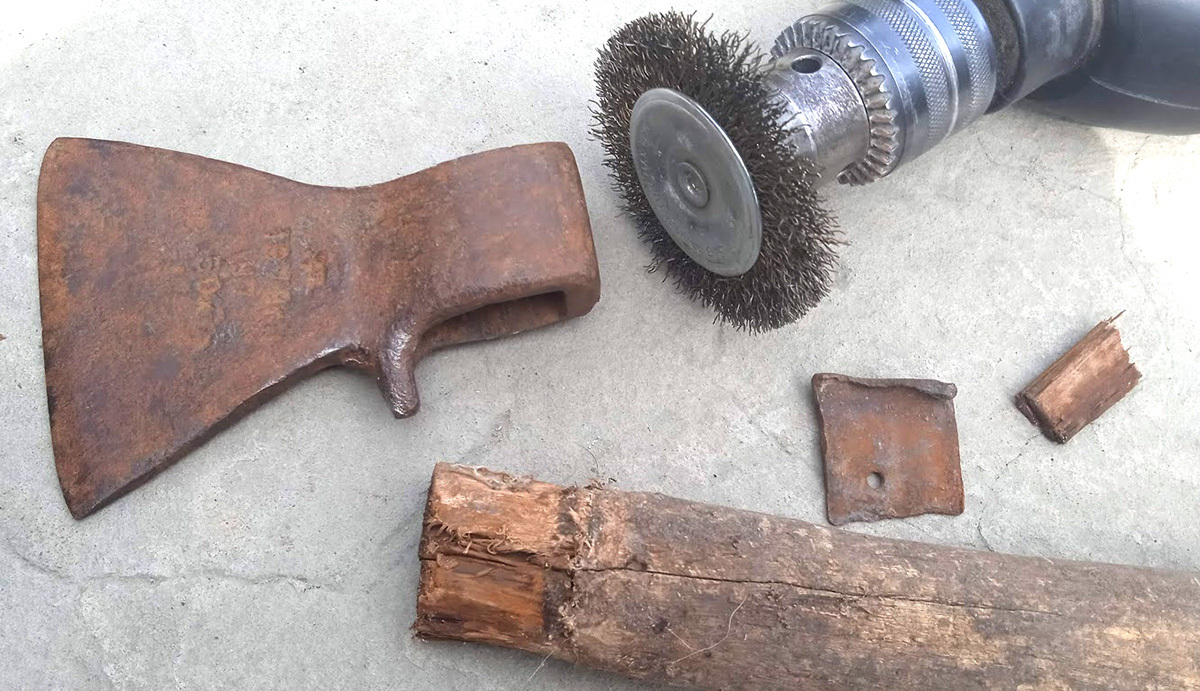 Древесина топорища треснувшая, местами прогнившая, его сразу на выброс - сделаем новое. Но сначала приведём в порядок сам топорик. Металлической щёткой отчистил верхний рыхлый слой ржавчины, и уже стало просматриваться какое-то клеймо.