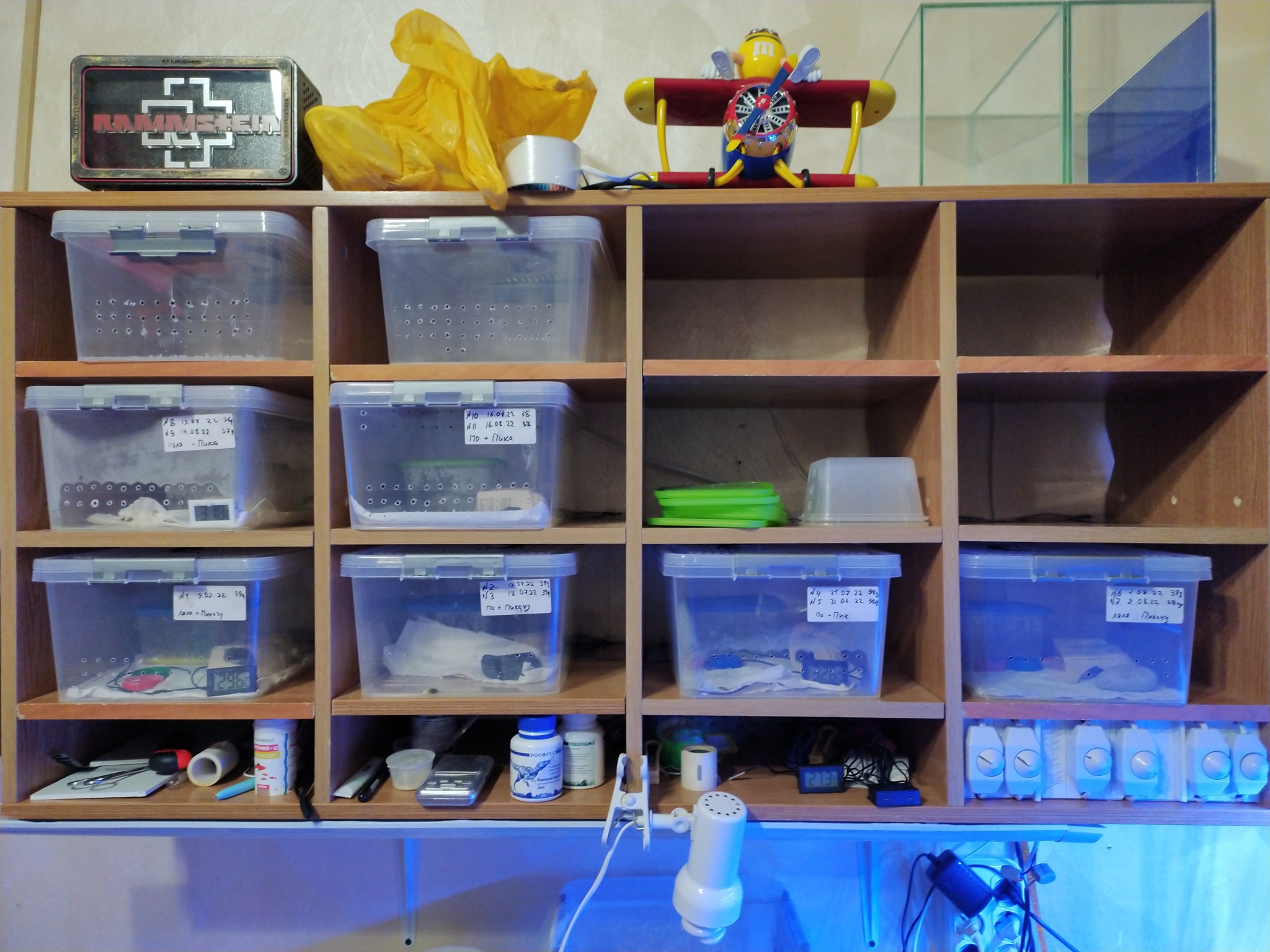 Слева полка с контейнерами в которых малыши живут от вылупления до 3 месяцев.