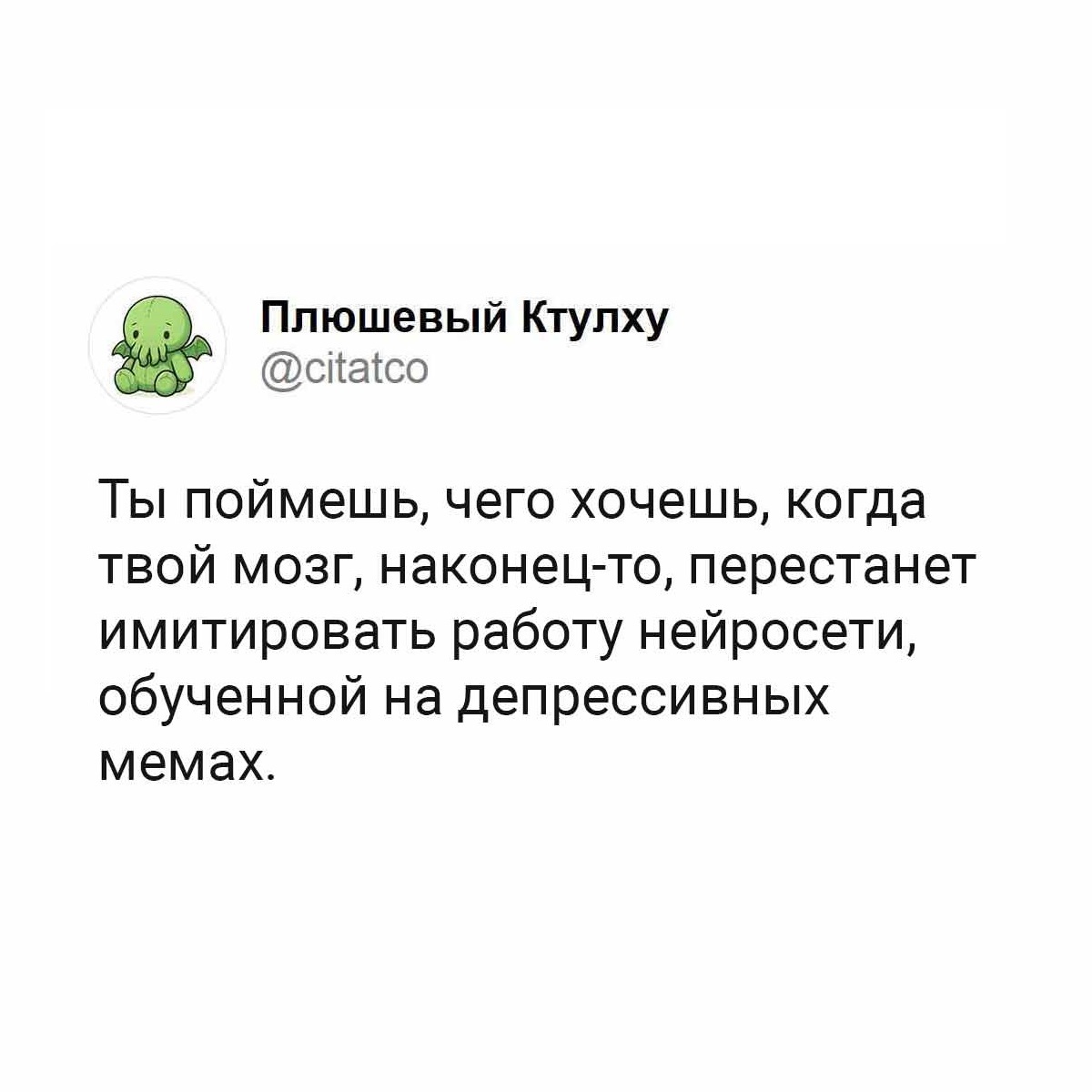 5 wouk Мозг - это плохо обученная нейросеть Серия Плюшевый Ктулху 3 месяца назад Требуется перепрошивка. [моё] Картинка с текстом Юмор Психология Нейронные сети Сарказм Депрессия 3 Ещё 0