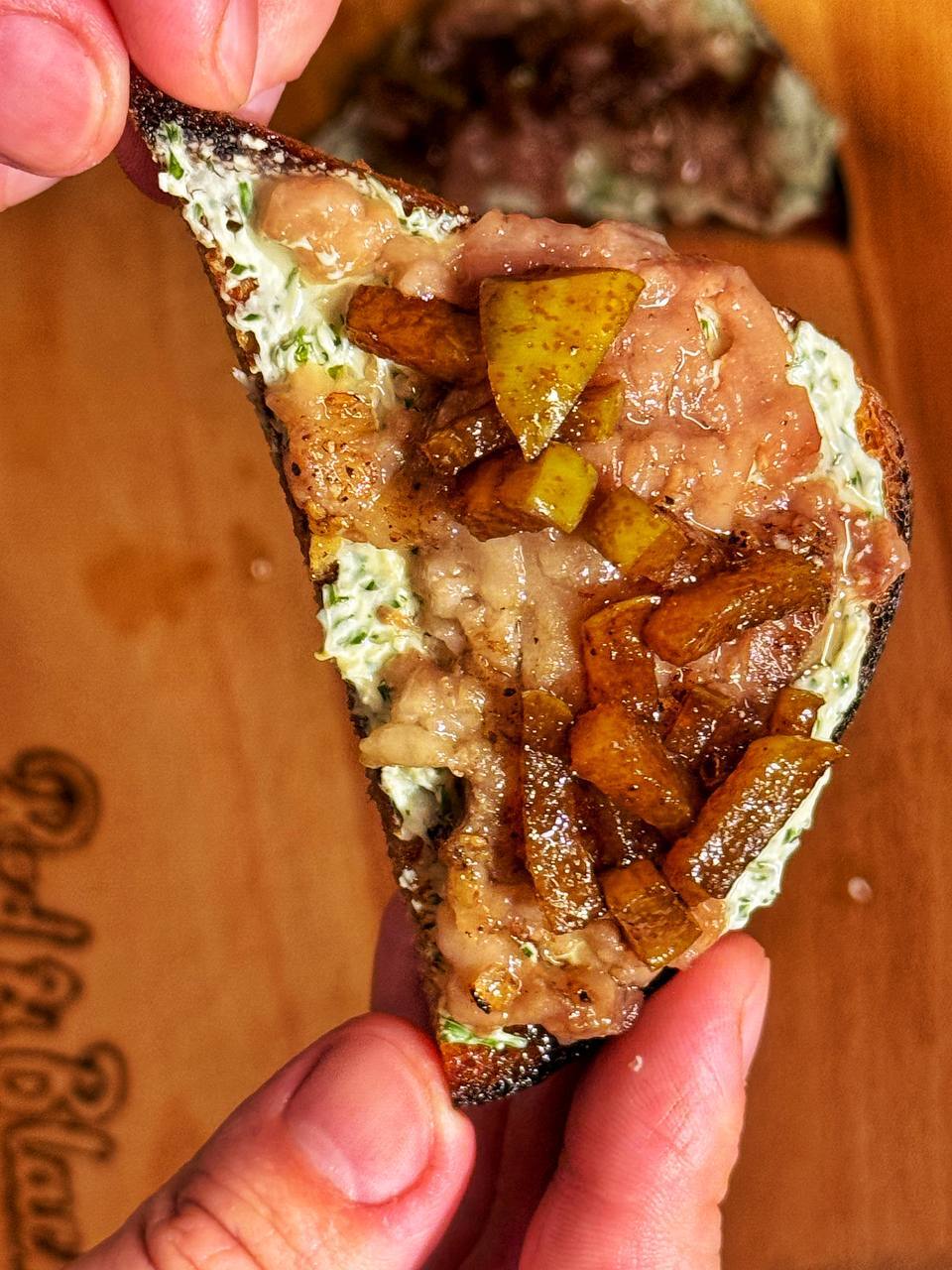 Поджарьте ржаной хлеб на сковороде до румяной корочки. Намажьте каждый кусочек сливочным спредом. Выложите на хлеб теплые мозговые кости и приправьте грушевым чатни.