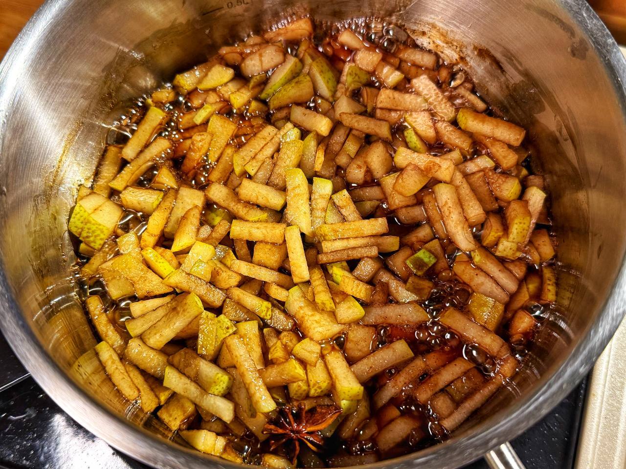 Грушу нарежьте мелкими кубиками или полосками. В сотейнике смешайте грушу, мед, бальзамик, корицу и бадьян. Тушите на слабом огне 10–15 минут до мягкости. Удалите бадьян в конце.