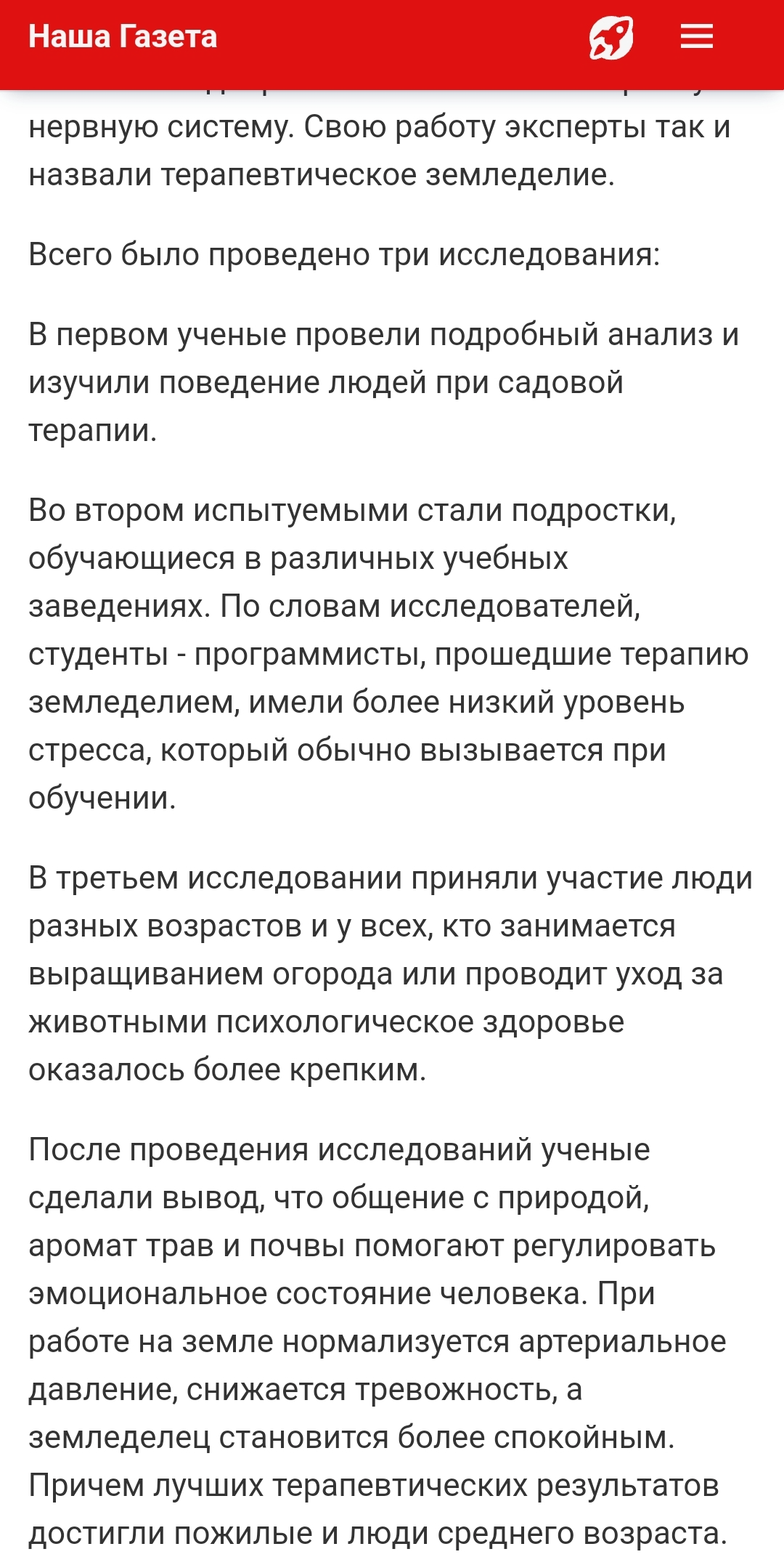 "Ученые выяснили, что копание в грядках на дачах схожа с приёмом антидепрессантов и снижает риск депрессии на 23 процента. Влияние интенсивности физической активности на снижения тревожности подчеркивает необходимость четких выполнений упражнений. Согласно данным нового исследования, умеренные физические нагрузки, такие как садоводство, гольф и пешие прогулки, связаны с более низким риском развития депрессии. Общий обзор нескольких анализов показал, что развитие депрессии сокращается на 23 процента, тревоги на 26 процентов и психоза или шизофрении на 27 процентов" https://www.m24.ru/news/obshchestvo/24042024/686696