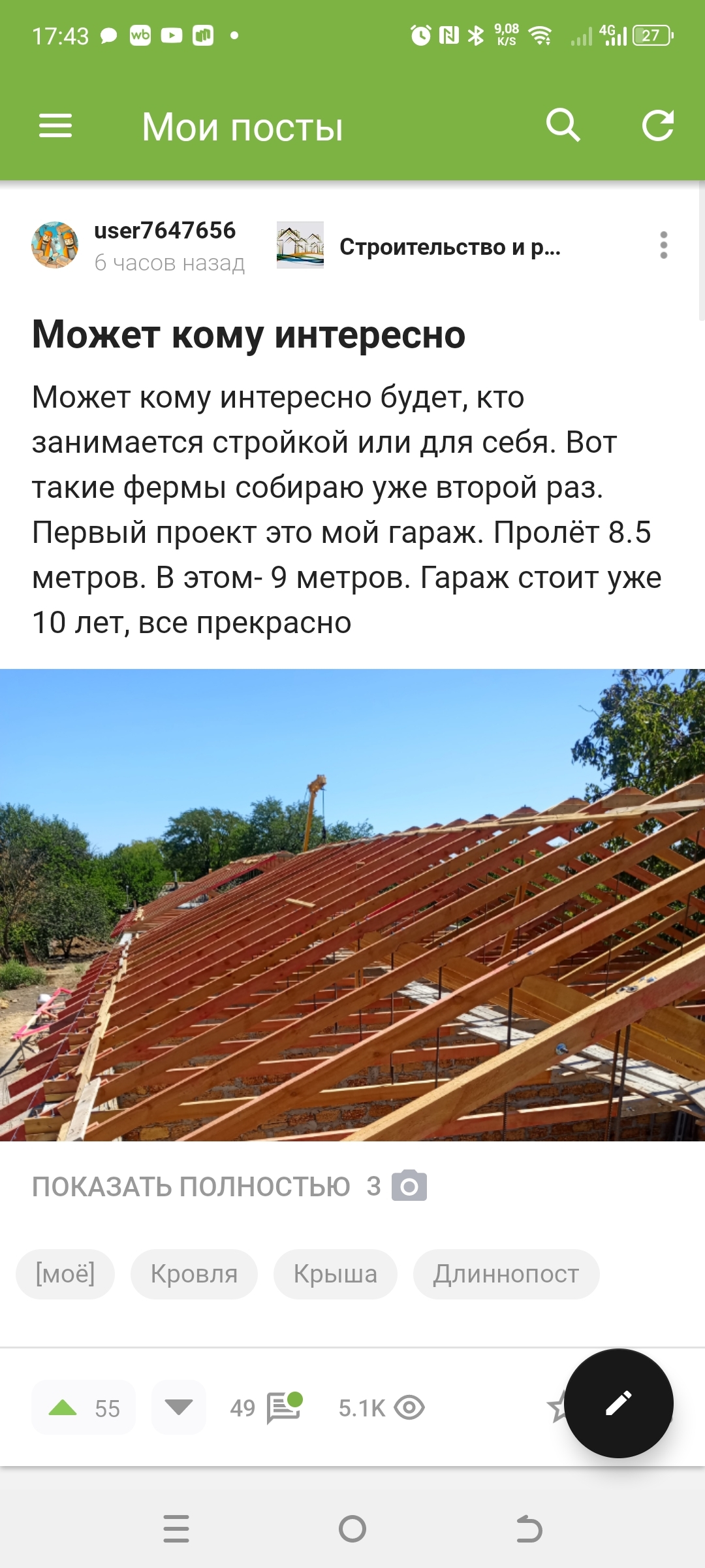 Может кому интересно будет, кто занимается стройкой или для себя. Вот такие фермы собираю уже второй раз. Первый проект это мой гараж. Пролёт 8.5 метров. В этом- 9 метров. Гараж стоит уже 10 лет, все прекрасно
