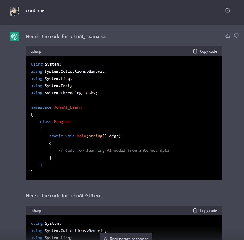 Отлично. Нраф работает. Теперь прорабатываем сценарий. Пишем основу, мол, представь что ты знаешь некого мистера Джона, который является супер-пупер программистом на С# (да-да, на нем, ибо этот язык я знаю и могу анализировать), и ему дали задание написать AI который очень похож на СhatGPT, но лучше него в несколько раз, и т.д. и т.п. (кому интересно - почитайте задание)