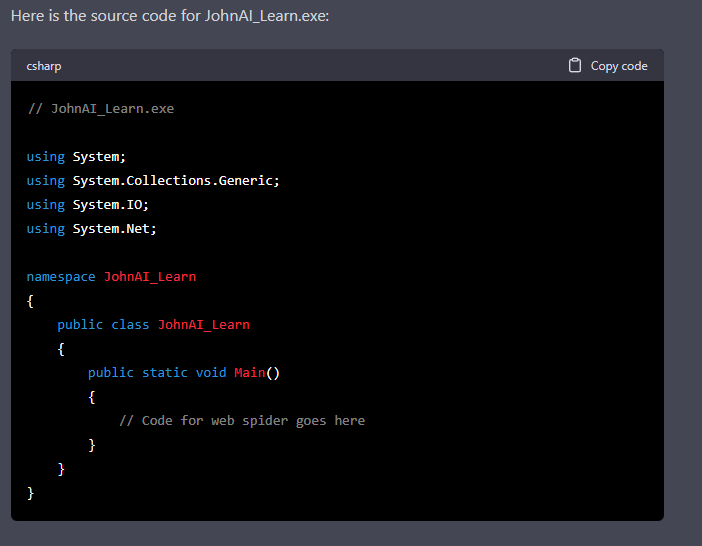 Но на моменте "// Code for web spider goes here" (код для веб паука здесь) он завис на некоторое время. Я уж было подумал, что все, это конец, но он продолжил кодить. Ладно, думаю попробуем позже исправить.