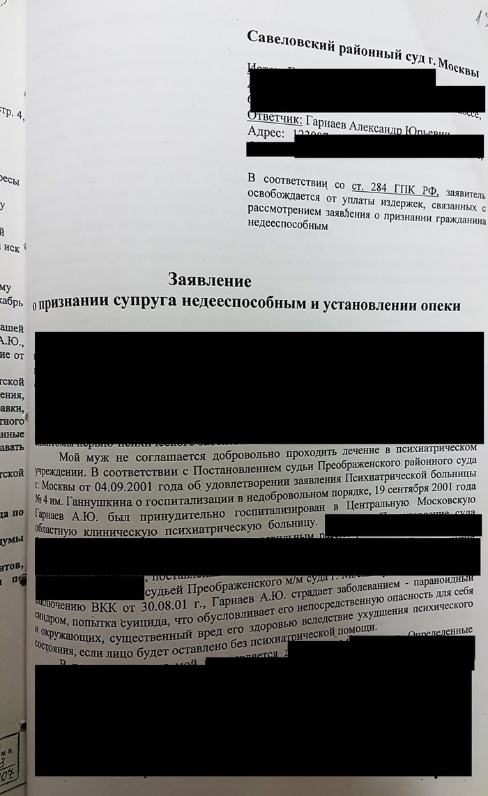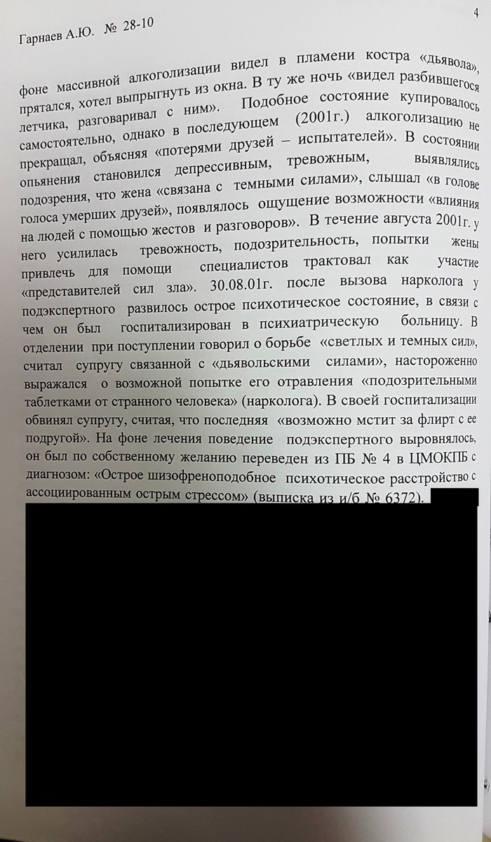 «Злоупотреблял спиртными напитками, неоднократно вызывались наркологи… Прибыл наряд милиции, который был вынужден вызвать психиатрическую бригаду… Гарнаевым А.Ю. предпринимались попытки суицида, пытался прыгнуть с 13-го этажа… Гарнаев А.Ю. говорил, что периодически видит дьявола… пытался в квартире устроить баррикады…»
