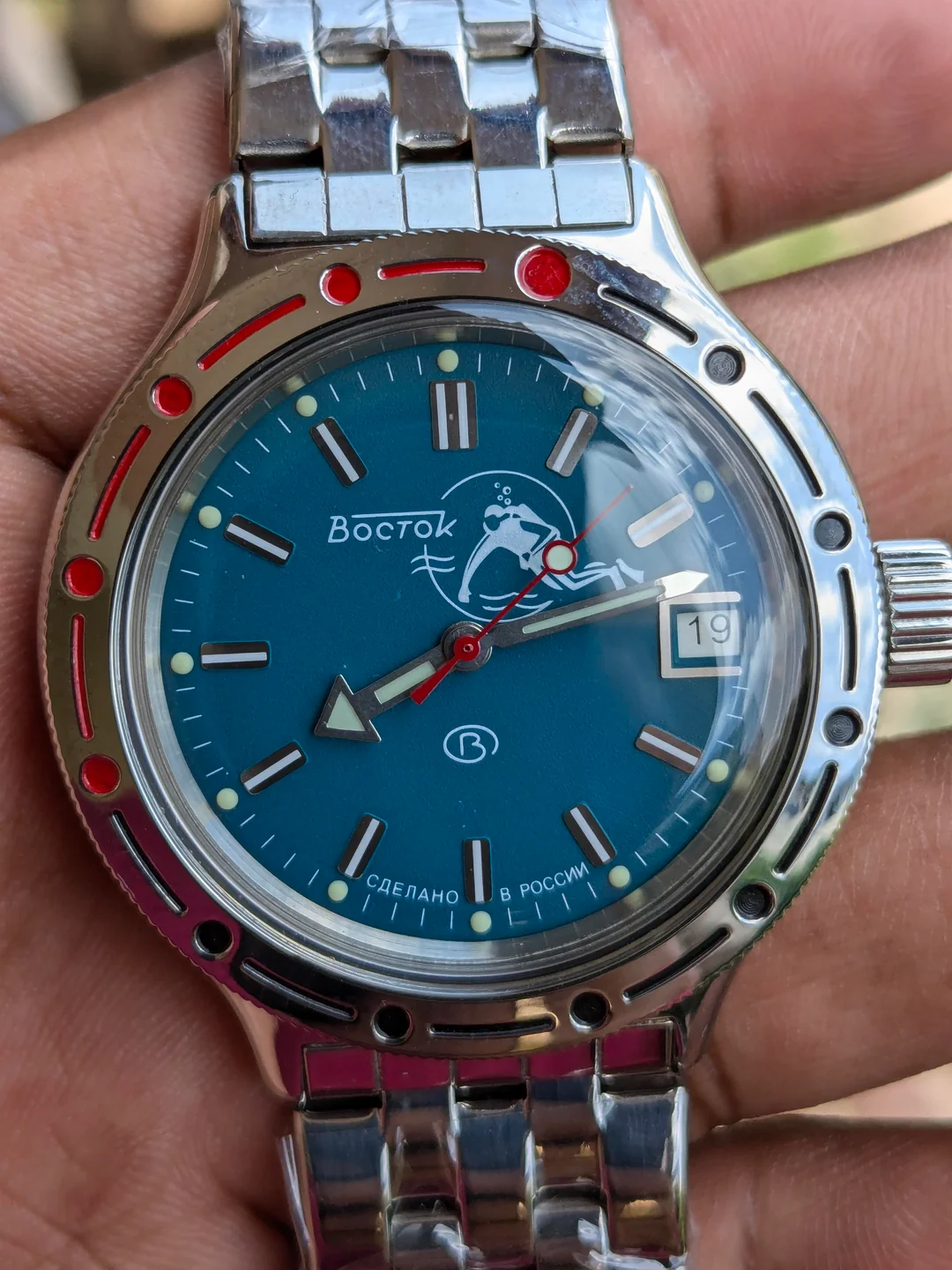 Мне кажется, что это Восток Амфибия Scuba Dude 420059, но, смотря на здесь продаваемую модель, металлический ремешок выглядит чуть иначе, ведь имеет три главных полосок составляющих ремешок вместо пять как выше.