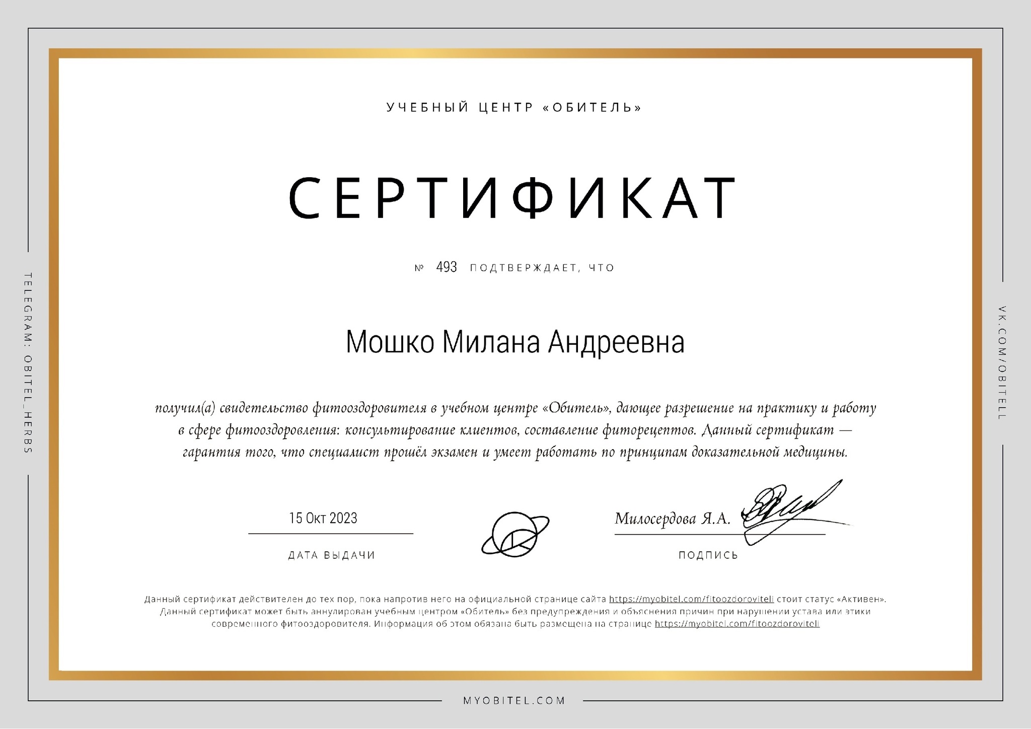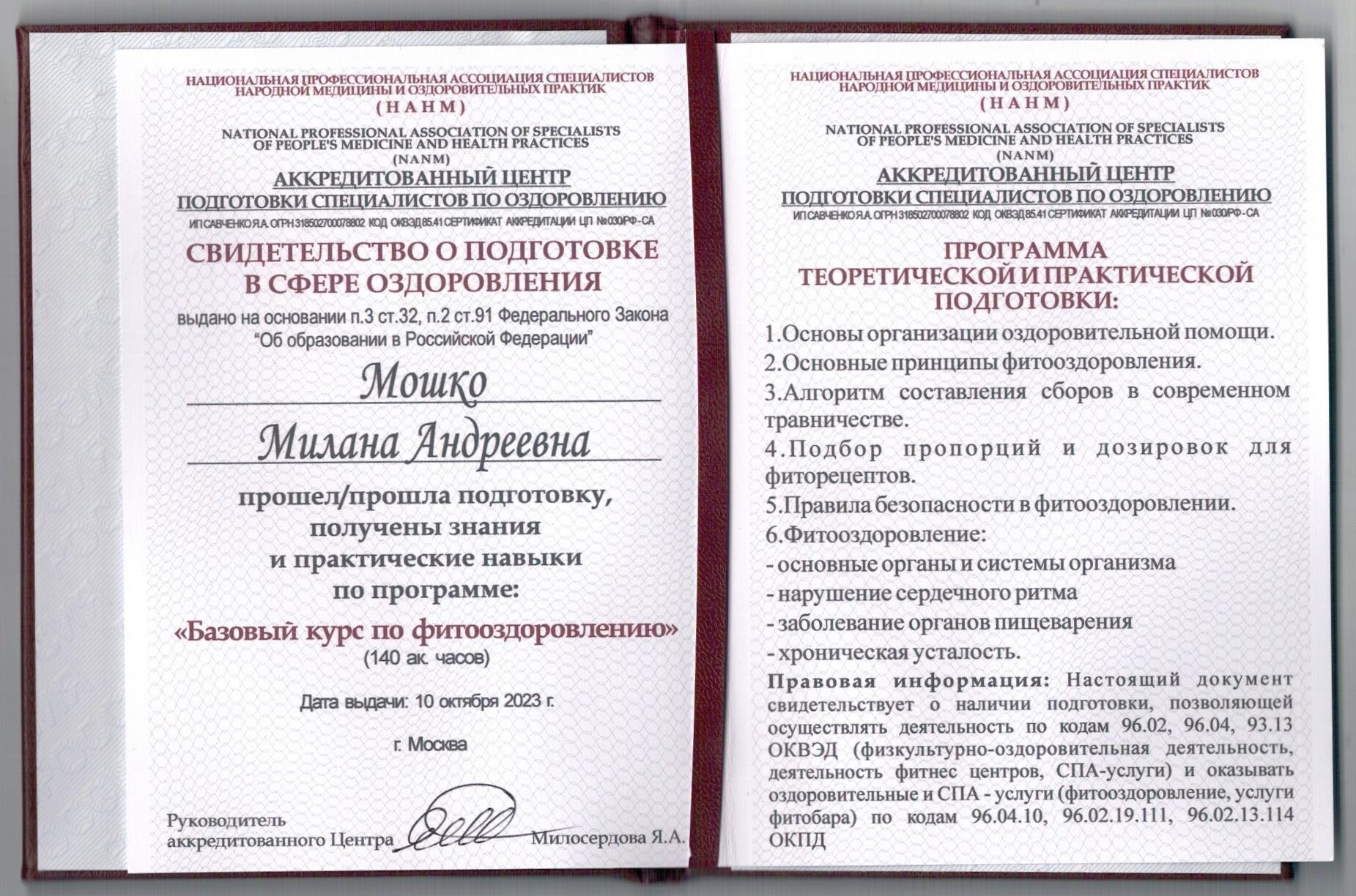Это могут быть: сертификаты от обучающих центров в комплекте с гос. дипломом от НАНМ или диплом о высшем медицинском образовании с доп. квалификацией фитотерапевта.
