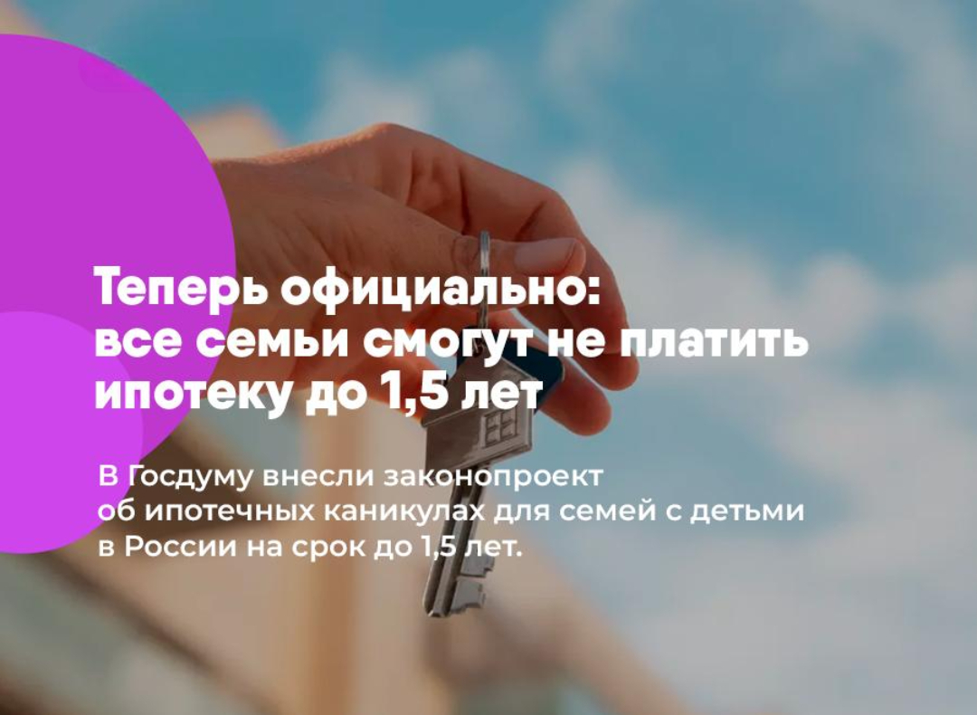 В Госдуму внесён законопроект, который позволит любой семье, независимо от дохода, получить ипотечные каникулы до 1,5 лет!
