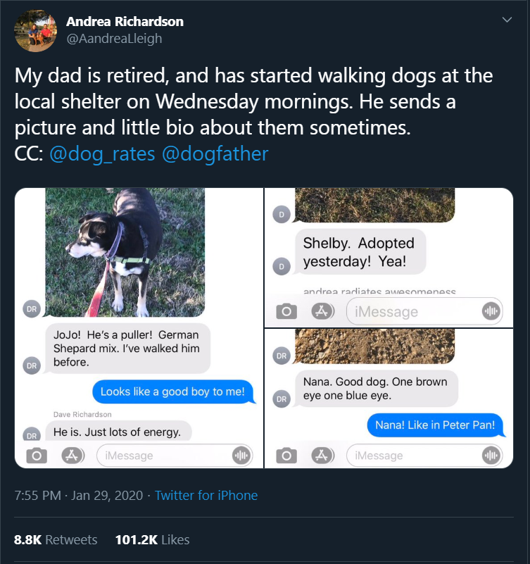 После выхода на пенсию, Дэвид узнал, что двое его соседей помогают местному приюту, выгуливая собак по средам, и решил присоединиться. Теперь многие просят, чтобы папа завел свой аккаунт в твиттер, но мужчина скромничает. Тем не менее, они с дочерью воспользовались возможностью и призвали остальных вносить посильную лепту в помощь приютам для животных, будь то финансовая помощь или физическое участие.