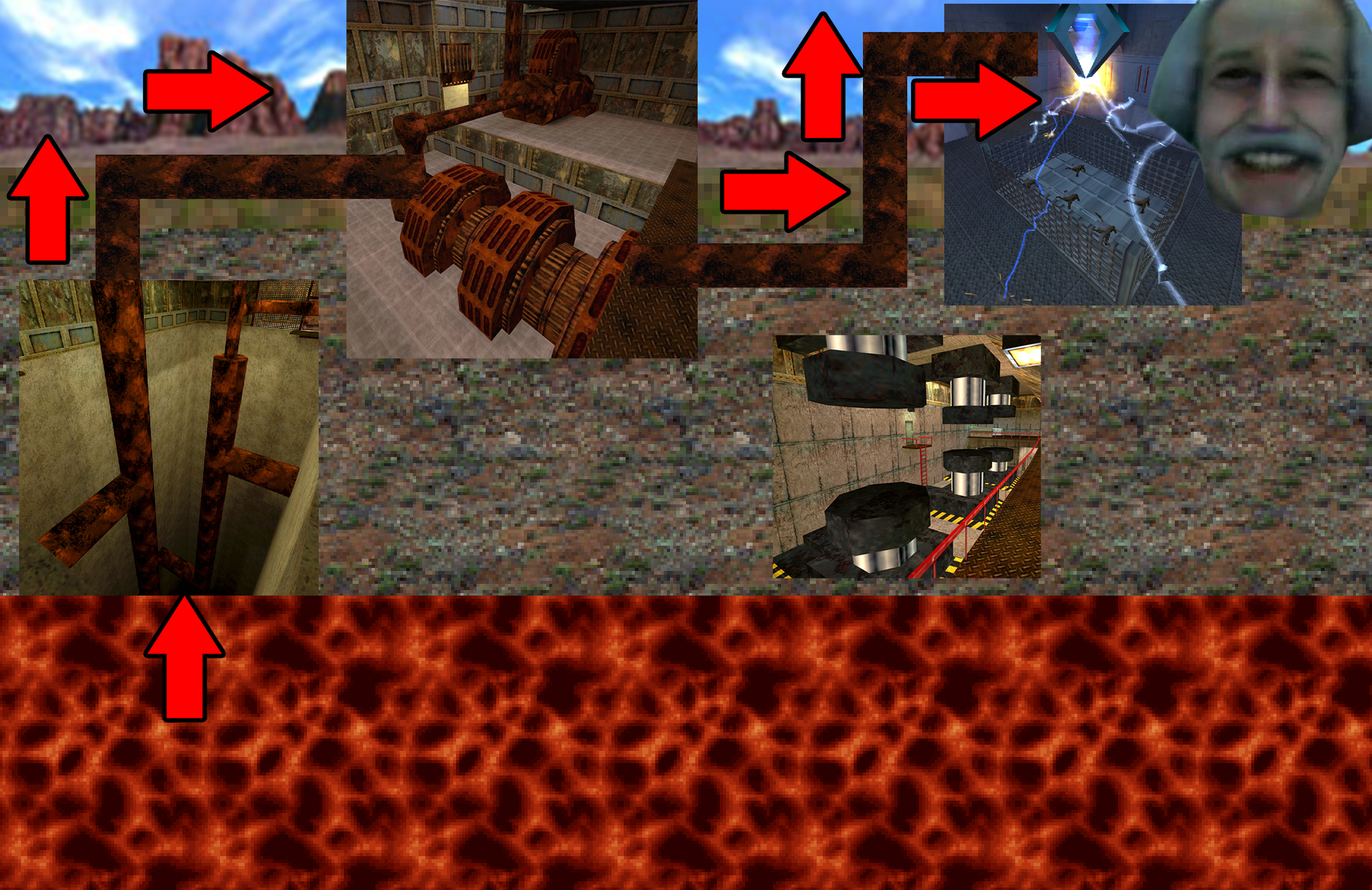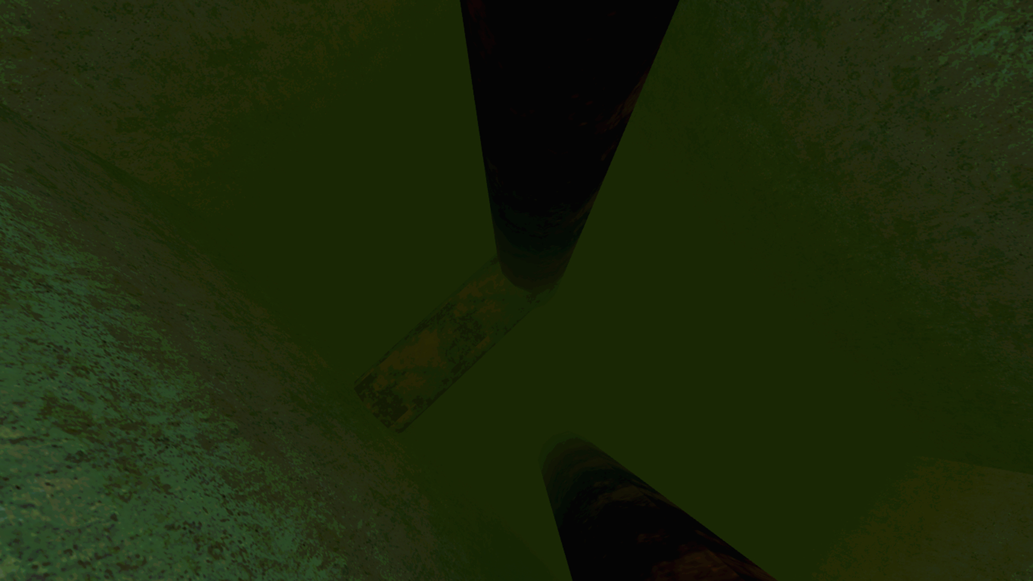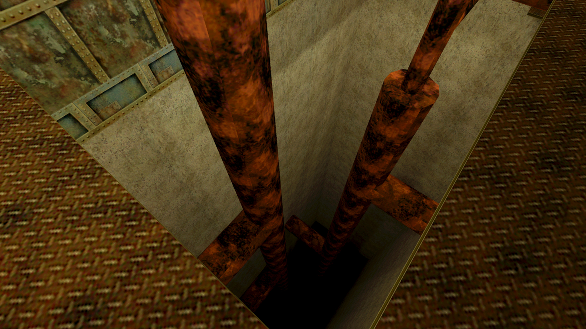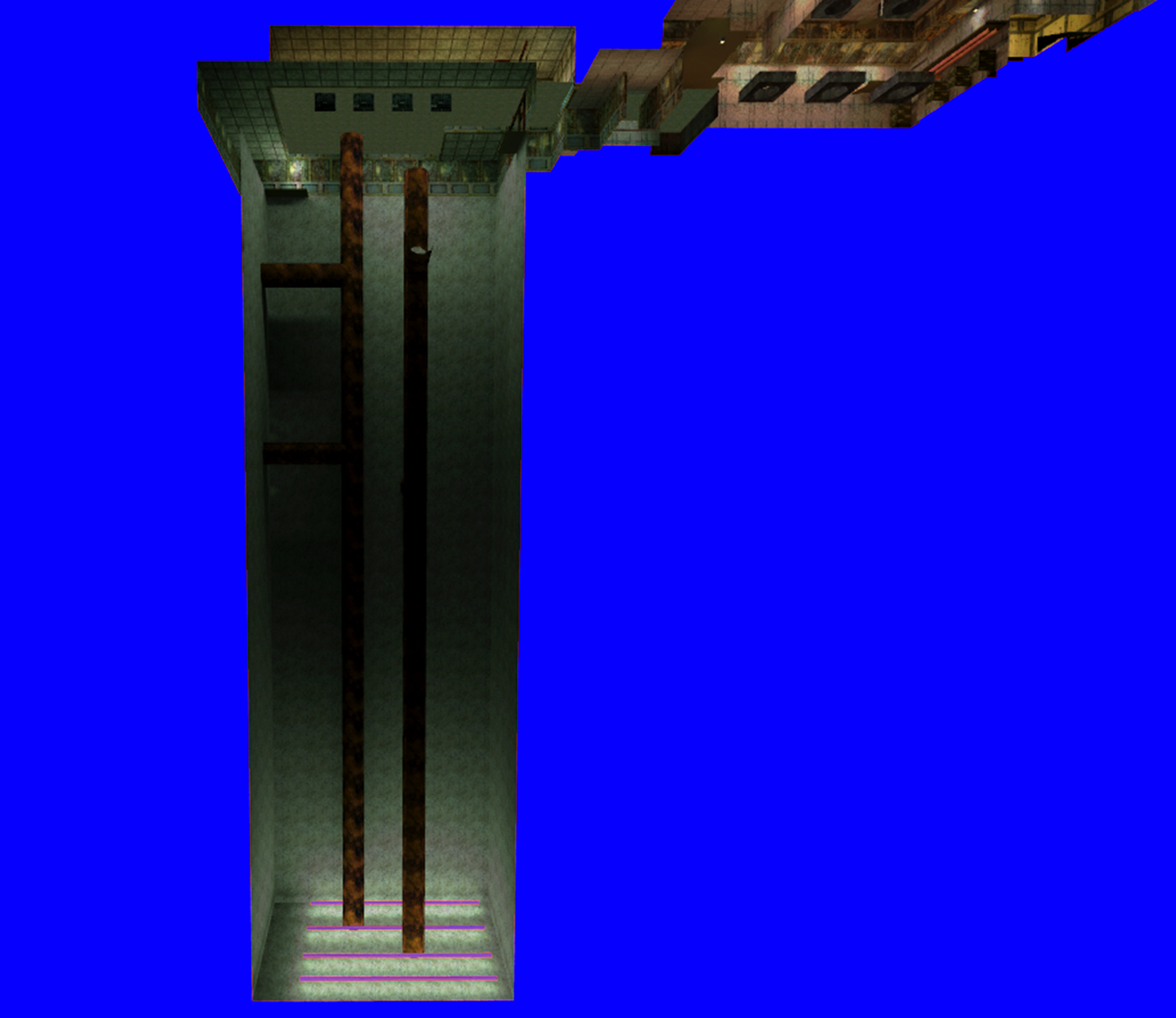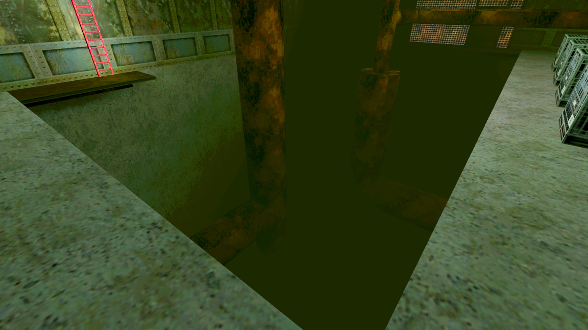 Все страннее и страннее. Черное дно оказывается фальшивой стеной - проходимым куском геометрии. Почему тогда сквозь него нельзя проплыть без ноклипа? А потому что сверху оно закрыто другим куском геометрии, который покрыт текстурой, не пропускающей игрока. Возможно маппер планировал какой-то пазл, где нужно было бы зачем-то плыть в темную страшную глубину. Но точного ответа мы не знаем.