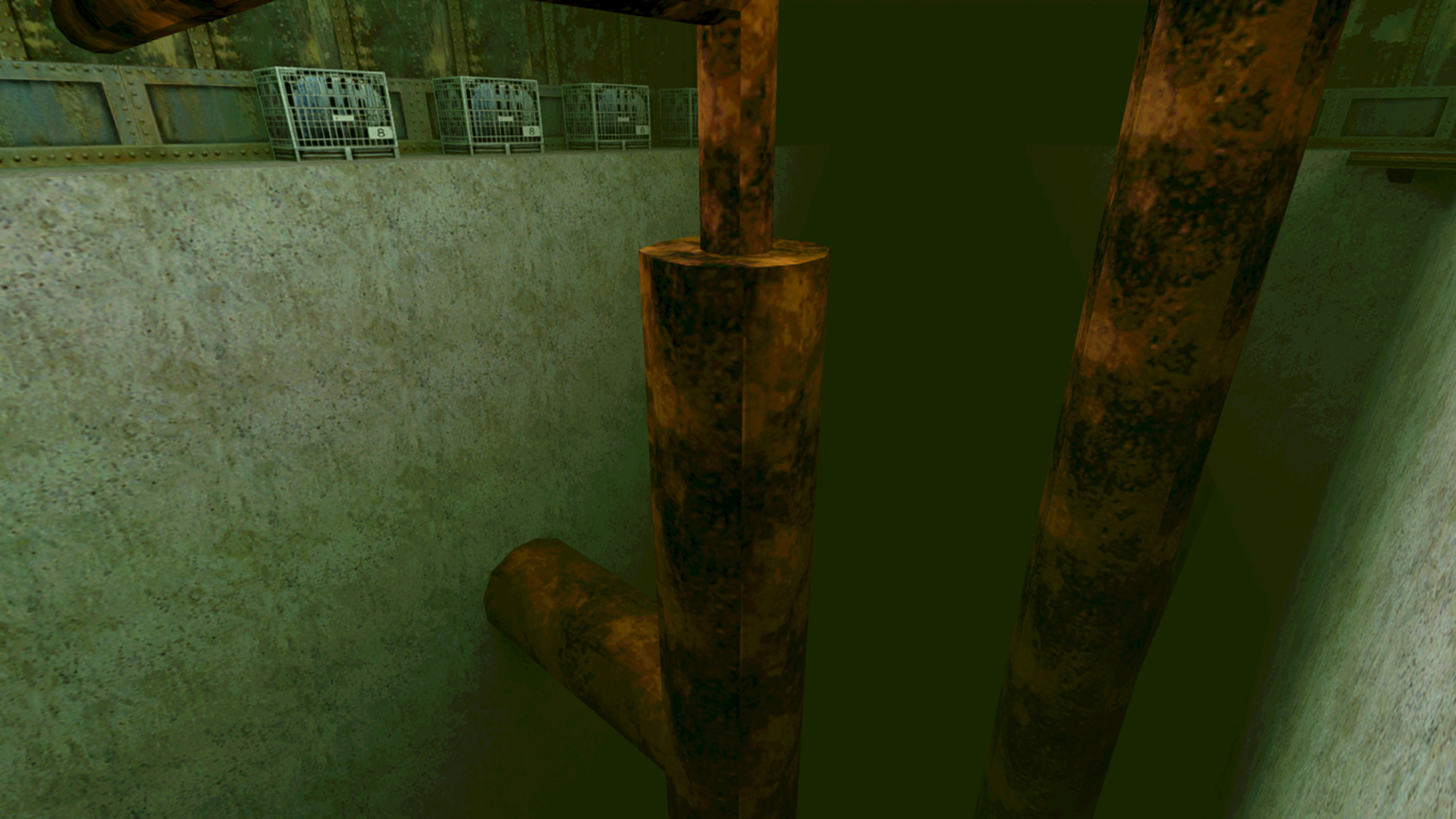 Вот мы под водой, тут у нас, как ни странно, вполне внятные и логичные проходы. Вот у стены стоят контейнеры с оборудованием. Ну и, разумеется, трубы. Они уходят куда-то глубже. Но насколько глубоко?