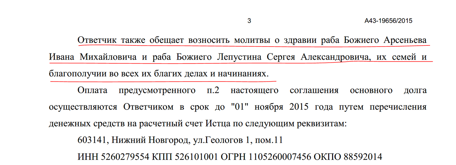 Нижегородский арбитражный суд вынес необычное решение по которому ответчик - Нижегородская Епархия РПЦ, в числе прочего, обещает МОЛИТЬСЯ за здравие истца! Данный документ размещен на официальном сайте арбитражного суда:  http://kad.arbitr.ru/PdfDocument/5ad62772-ee40-4aac-8a4a-944...