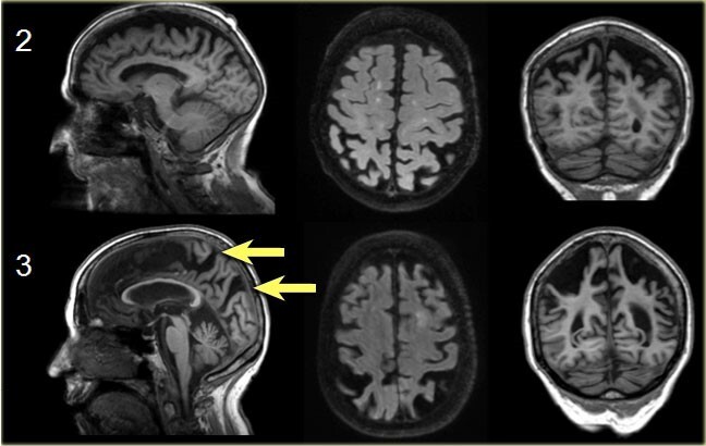 3: атрофия по типу «лезвие ножа»/тяжелое расширение желудочков;.