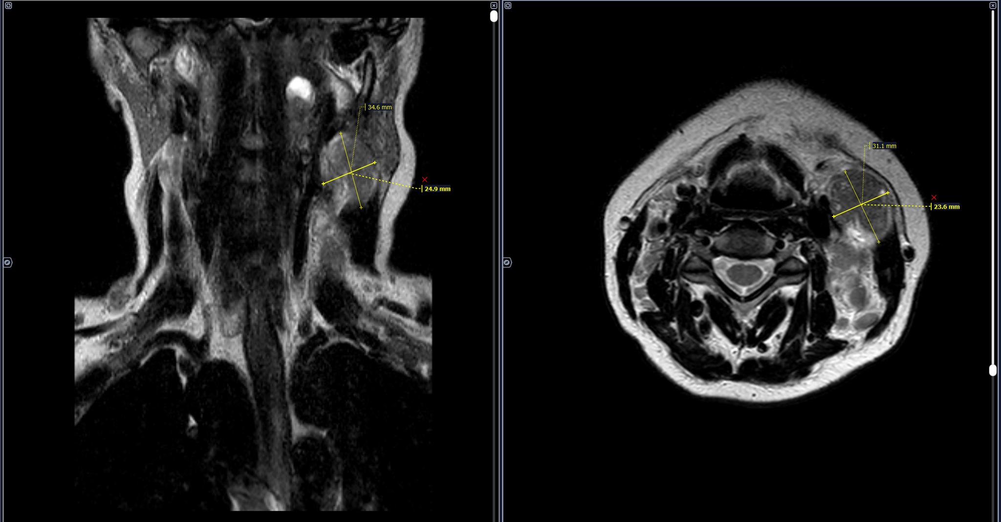 В левом окологлоточном пространстве определяется объемное образование овоидной формы, неоднородной кистозно-солидной структуры, с неоднородным контрастированием, размерами 3,4х2,4х2,3 см.