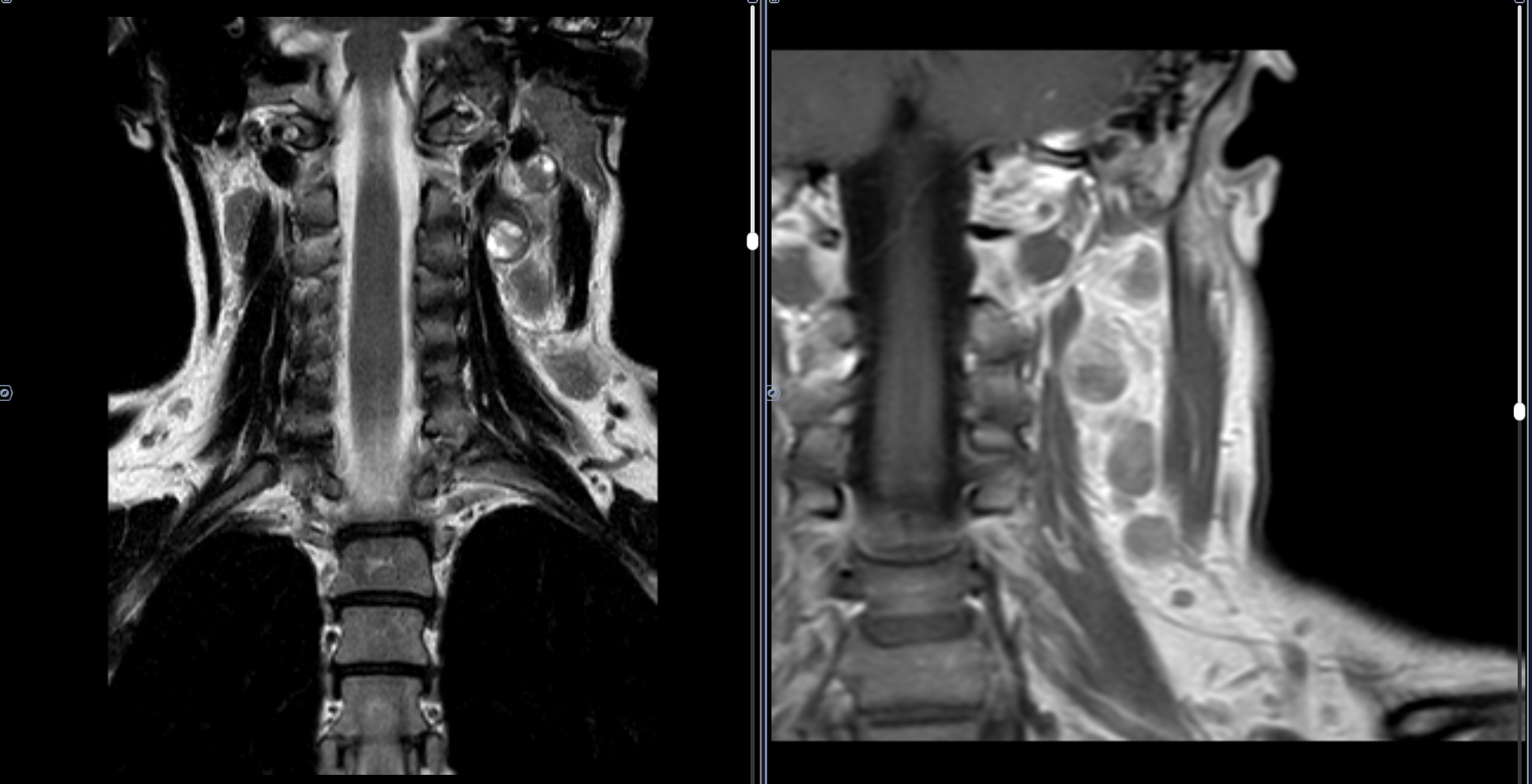 Заключение: МР-картина шейной лимфаденопатии - наиболее соответствует mts. Образование в левом окологлоточном пространстве: злокачественное новообразование/крупный mts в лимфоузел.