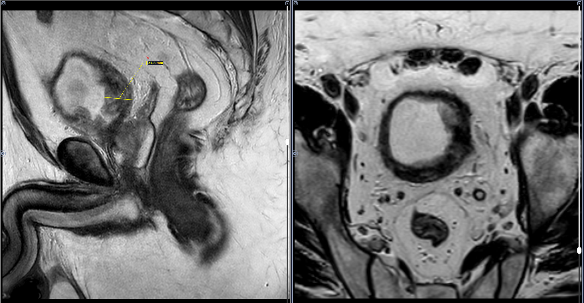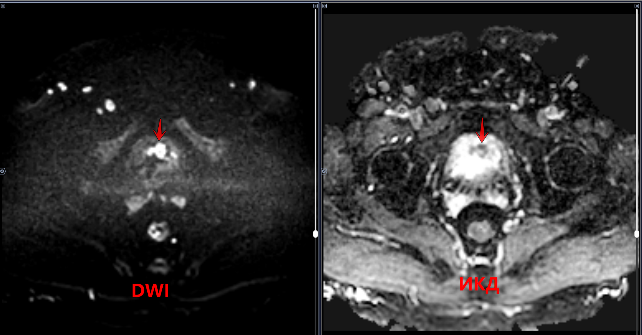 Мочевой пузырь заполнен умеренно, стенки его неравномерно утолщены, в полости визуализируется объемное солидное образования, с четкими, бугристыми контурами, исходящие: из левой боковой и частично задней стенок на 12-18 часах условного циферблата в аксиально проекции, прорастающее все стенки мочевого пузыря с микроскопической тяжистостью окружающей паравезикальной клетчатки слева, с деформацией стенок мочевого пузыря, с зонами ограничения диффузии(гиперсигнал на DWI, гипо на ИКД) во внутренних отделах образования. Предстательная железа увеличена в объеме-признак ДГПЖ.