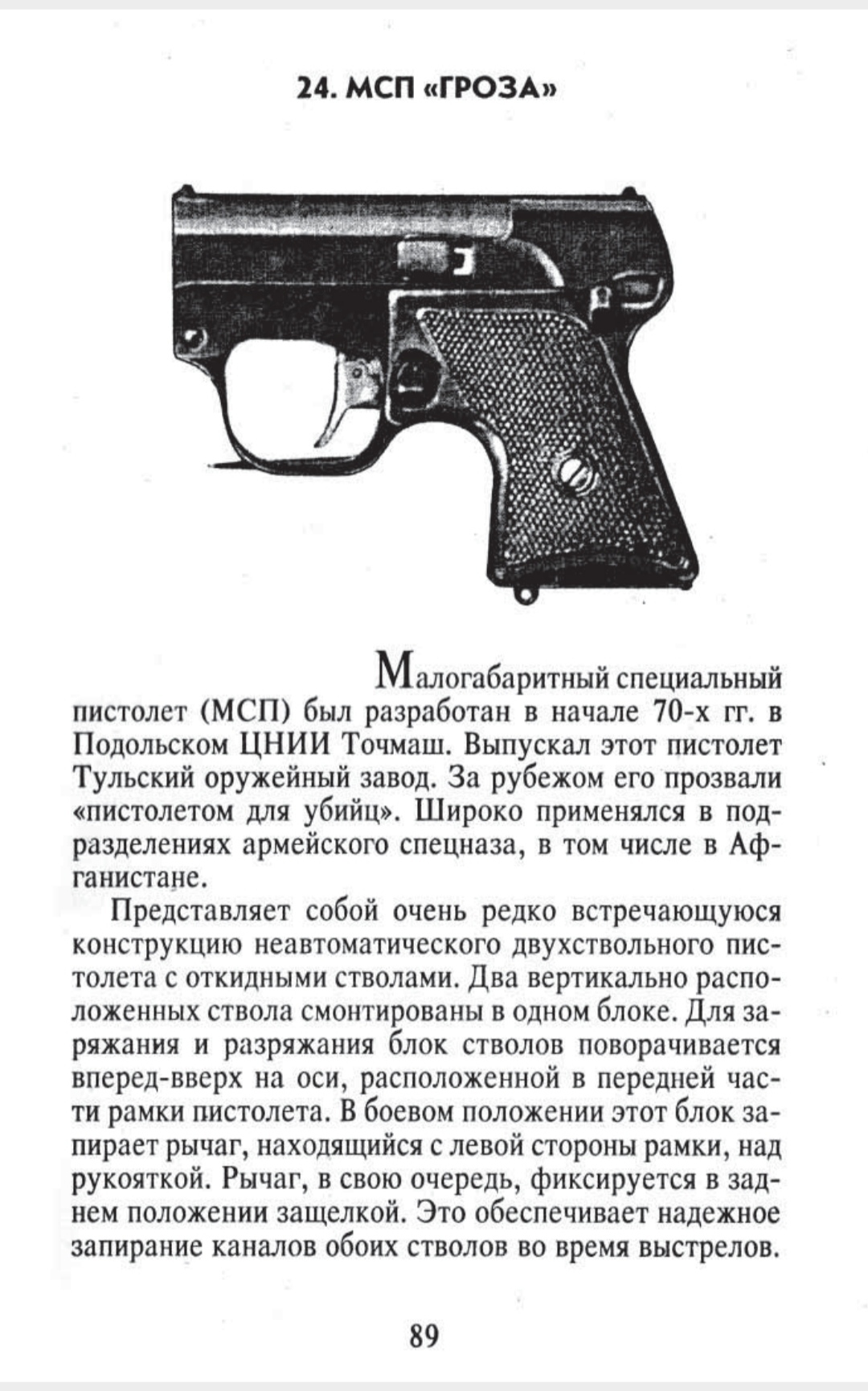 По запросу «пистолет МСП» поиск выдал ссылку на википедию, где русским по белому написано следующее: «МСП „Гроза“ (Малогабаритный Специальный Пистолет; Индекс ГРАУ — 6П24) или иногда ТОЗ-37 М — советский бесшумный двуствольный пистолет, созданный в ЦНИИточмаш по заказу КГБ СССР в 1965 году и принятый на вооружение 24 августа 1972 года в соответствии с приказом министра обороны СССР № 145».