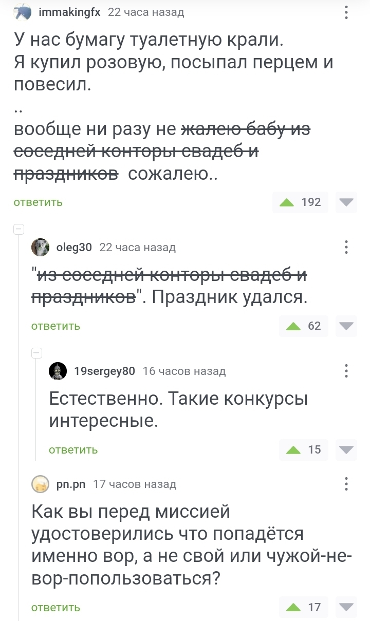 41 OCTPOB0B Мстя 2 года назад #comment_280238316 Скриншот Комментарии на Пикабу Юмор Кража Месть Туалетная бумага Длиннопост Ещё 0