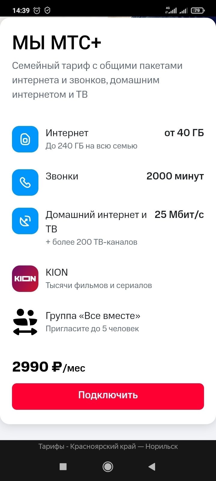 Тариф "Мы МТС+". Домашнее телевидение, домашний интернет и мобильная связь. 28 числа каждого месяца списывается абонентская плата 2990 за месяц вперёд.
