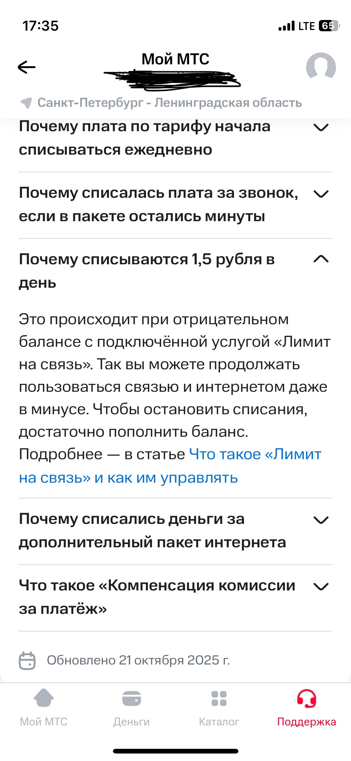Мало ли кто-то так же не заметил нововведения (ну или я такая не внимательная что увидела только сегодня) и я сэкономлю вам чуть-чуть ваших денежек. Тут зашла в приложение и увидела что списалось в ноябре 9 рублей, не страшно, но у меня достаточно дорогой тариф и там все включено. Появился закономерный вопрос, а с хера ли тогда теперь каждый день минус 1,5 рубля? Долго копалась/разбиралась и оказывается если на счету минус (был взят обещанный платеж), то оператор будет каждый день списывать за этот минус 1,5 рубля. Такие вот пироги. Проверьте у себя, меня не предупреждал МТС о такой фишке.