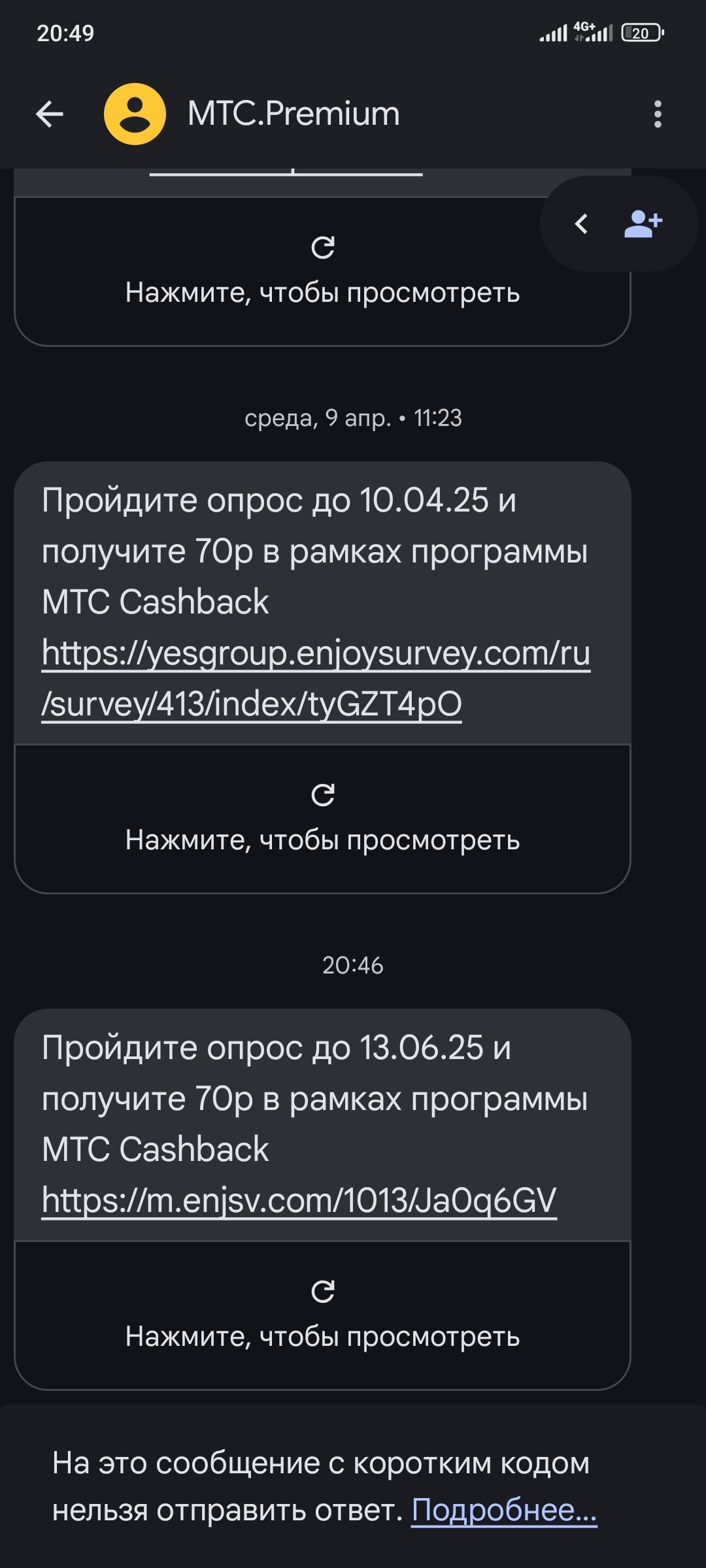 10 Ma3uJIko Лига мобильной связи МТС как всегда... 6 месяцев назад Пришла ссылка от МТС на опрос с кэшбэком на 70 рублей. Прохожу опрос, а оказывается это развод. [моё] МТС Сотовая связь Обман Опрос Длиннопост Негатив Ещё 0