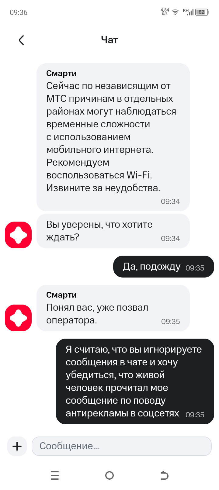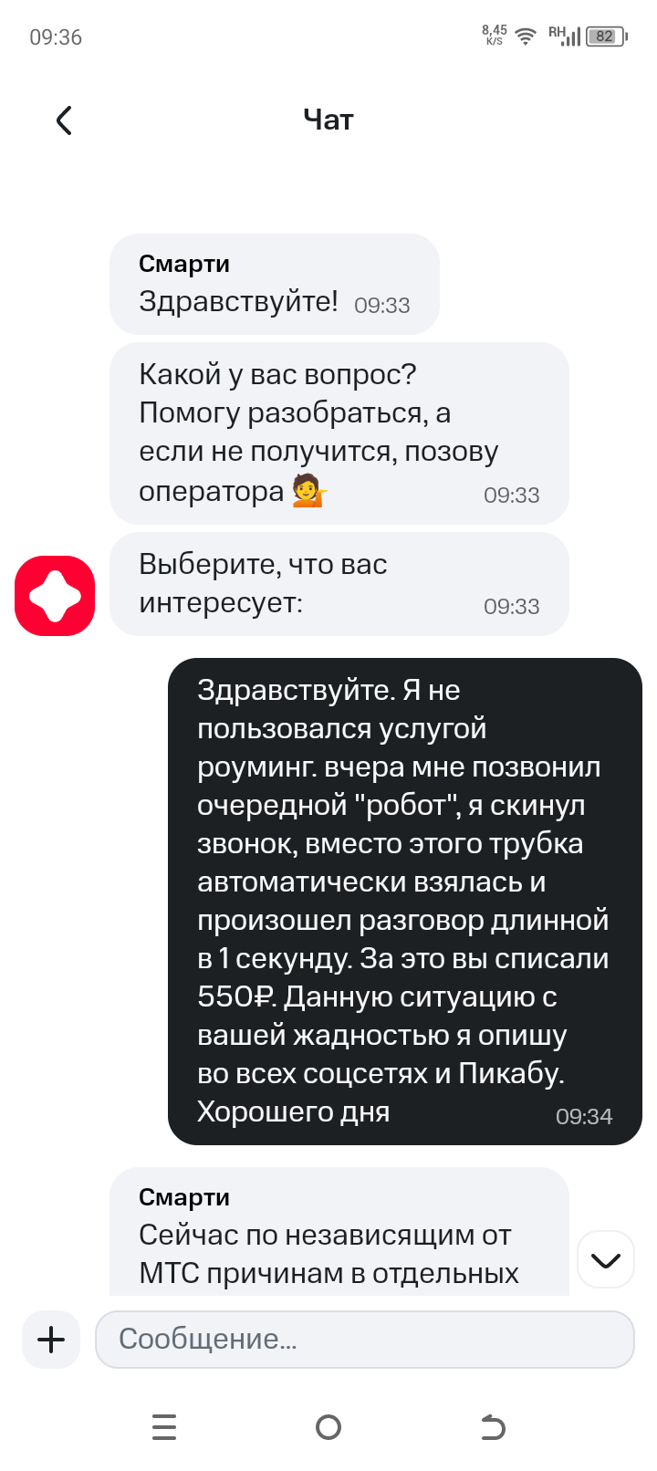 Нахожусь на отдыхе за границей, все коллеги и близкие об этом знают и, поэтому,не звонят, вчера раз пять звонил, как я предполагаю "рекламный робот", четыре раза я успешно сбросил, на пятый раз случайно взял трубку. 1 секунда "диалога" Итог: -550₽. Спасибо @MTS,