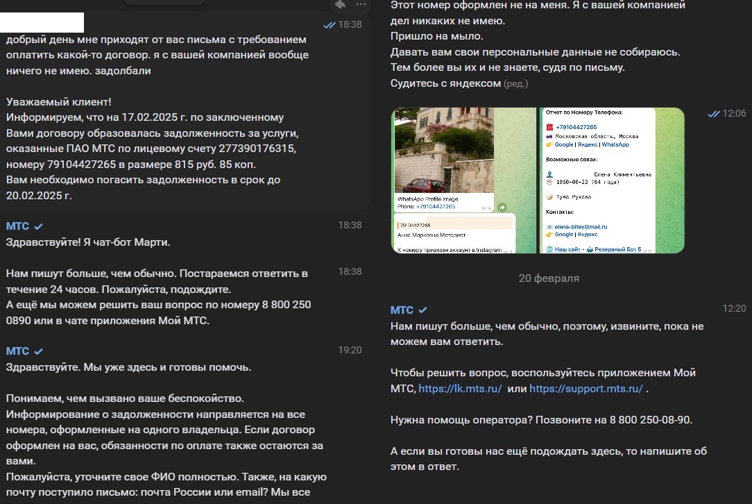 Каждый месяц эта контора добоебов присылает мне счет на оплату номера, причем как к неизвестному лицу (уважаемый клиент). В общении с техподдержкой просят предоставить ФИО (ну да, семи ж не знают, кому номер продали). Видимо хотят добавить в базу)))). При этом номер, естественно, не за мной, никогда в мтс не покупал. Я даже проверил через бот, номер какой-то тетке из МО принадлежит.