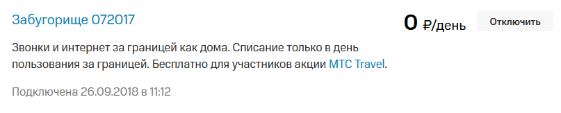 Находясь в роуминге, имел неосторожность принять телефонный звонок. Внезапно со счёта списывается 410 рублей. Смотрю в личный кабинет, вижу списание с комментарием "Забугорище 072017". Ищу такое среди подключённых услуг... Насилу нашёл. Среди бесплатных, с ценой 0 руб/день и комментарием "Подключена 26.09.2018 в 11:12". Обращаюсь в поддержку, отвечают, что "услуга была подключена вместе с тарифом" (Кто-нибудь просил? В тарифе есть свои условия роуминга), бесплатной она числится, потому что "на территории РФ она бесплатна", а вернуть деньги невозможно, поскольку услуга оказана.