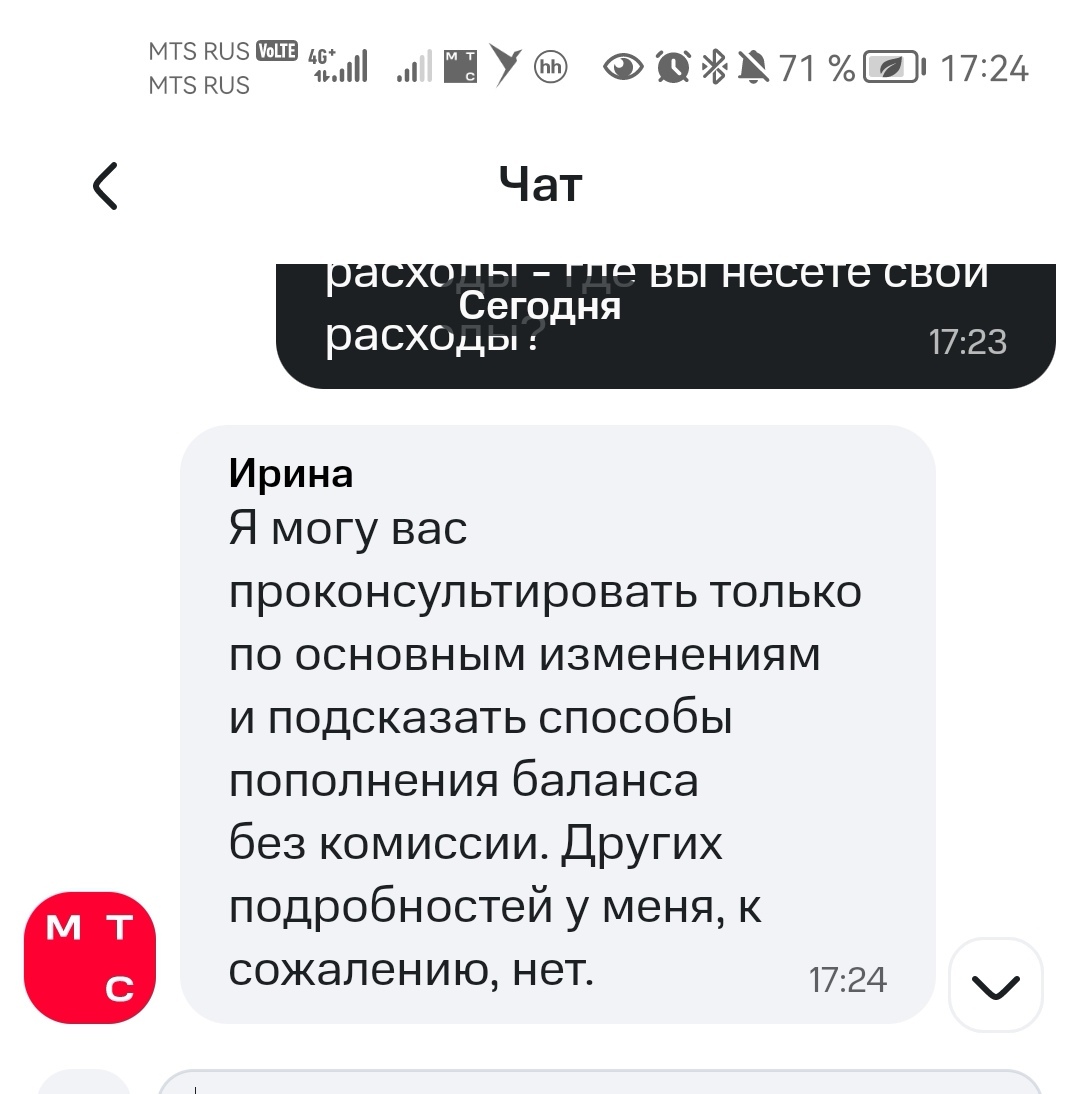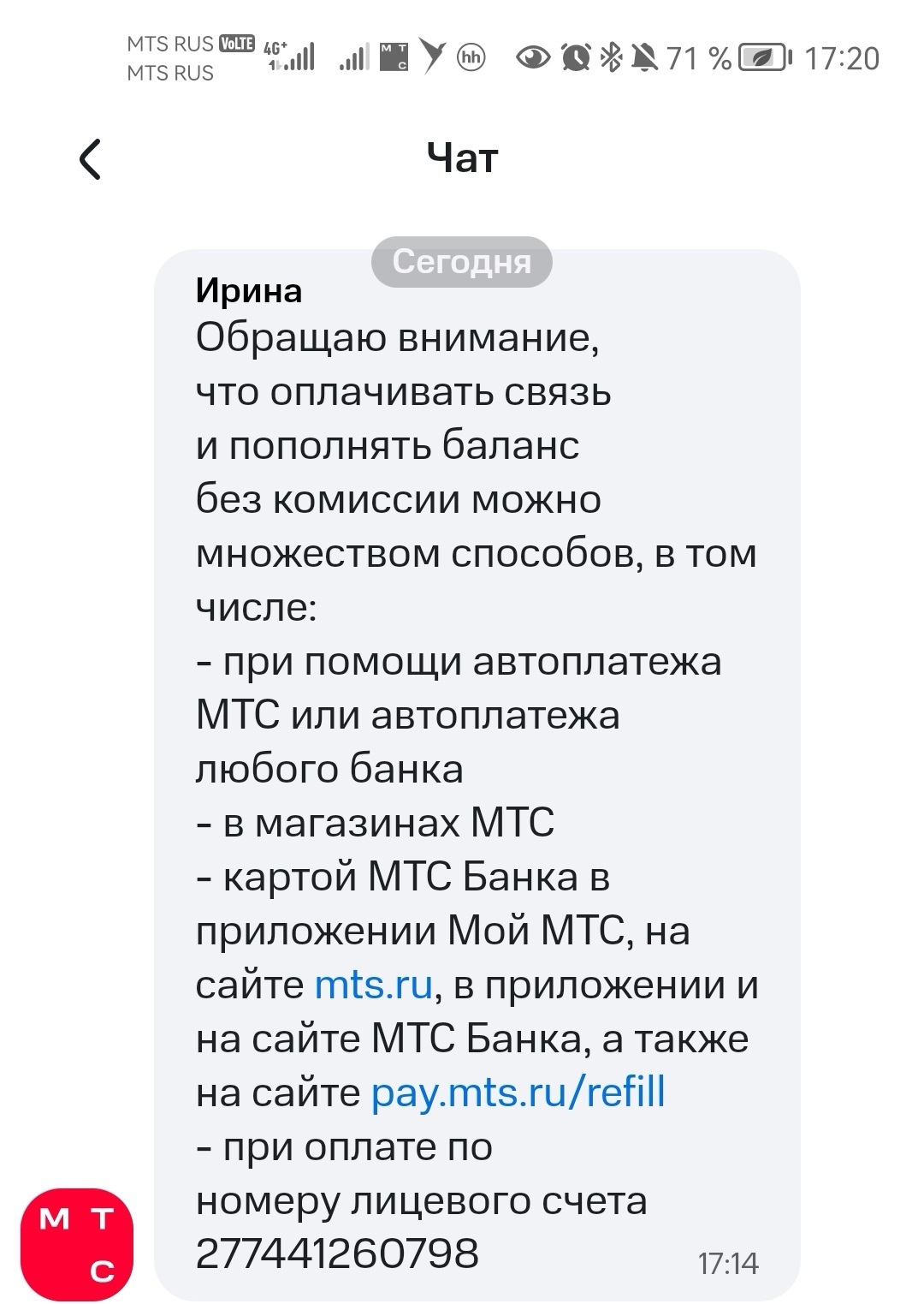 Имею домашний интернет МТС с привязкой к СИМ-карте. Как обычно оплатила в этом месяце услуги через оплату с Т-Банка как обычно на номер телефона. Захожу в кабинет, а у меня сняли комиссию за пополнение счета 1%. Вышла на поддержку и вот их ответы на скринах. Из всего этого вижу, что идёт полное навязывание услуг МТС-банка и МТС-магазинов. Это вообще на каком основании? С чего вдруг такие вот услуги? так и не поняла какие такие дополнительные расходы несёт МТС через пополнение их счетов с других банков?