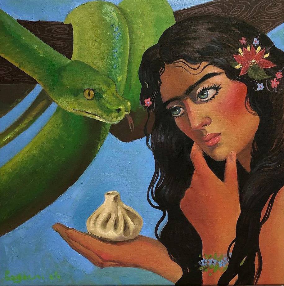🐍🖼️ Сатана в обличии змея соблазняет Еву хинкали. Работа Алёны Багаури.