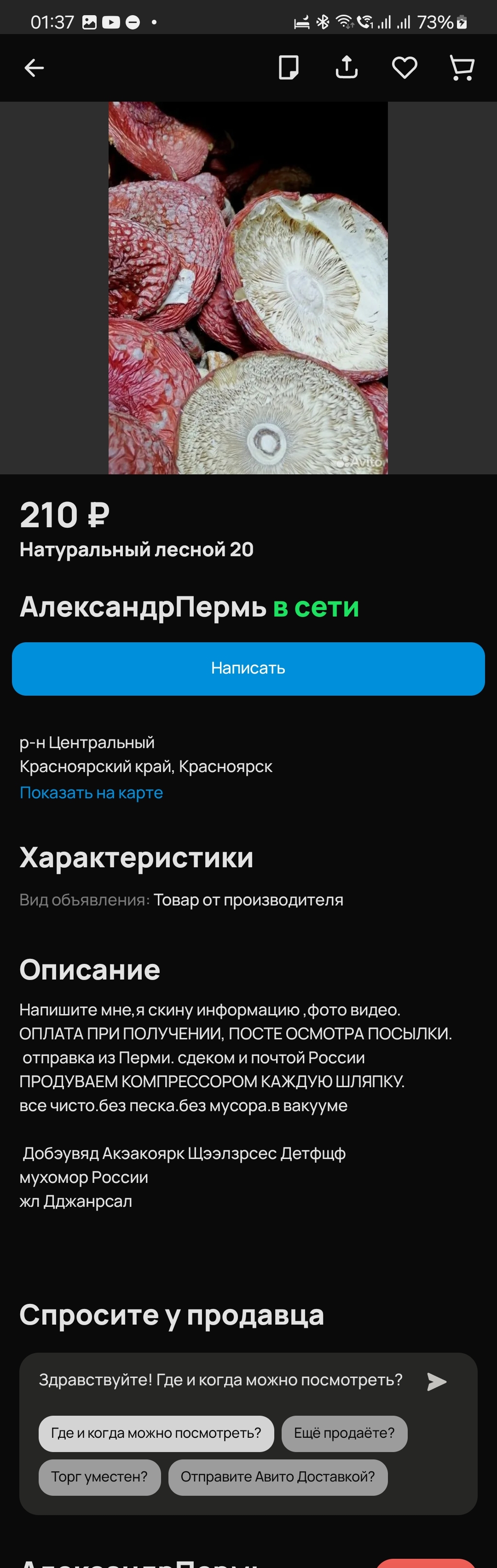 Есть официальный ответ bashkirskii Мухоморы на авито 10 месяцев назад Наткнулся сейчас на объявление о продаже мухоморов. Мне казалось, что это запрещено. Нет? Авито Объявление Длиннопост 1 Ещё 0