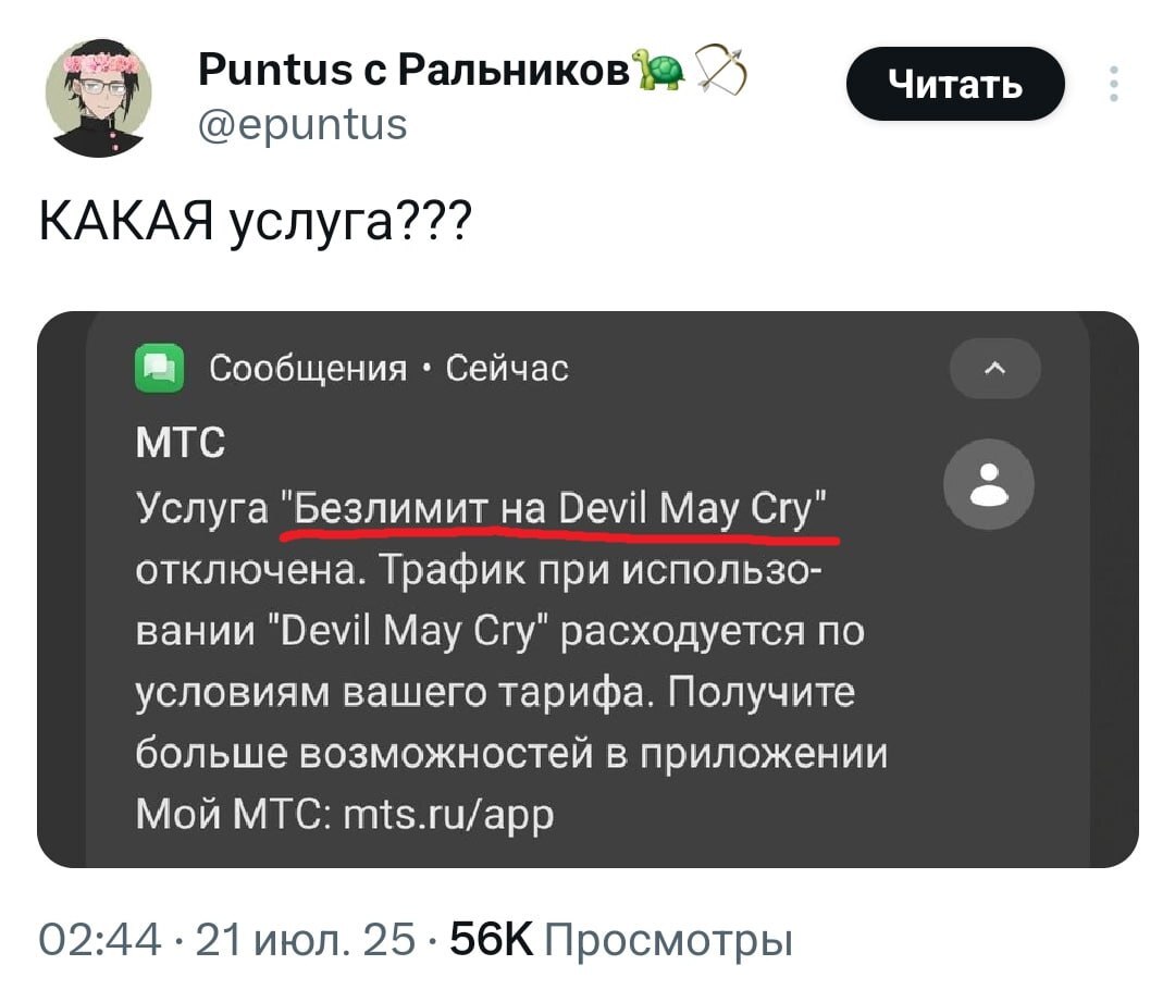 9 Otaku.Bunker Мультивселенная мобильных тарифов изучена только на 5% 4 месяца назад Скриншот МТС Devil May Cry Сотовые операторы Мемы Игры Ещё 0