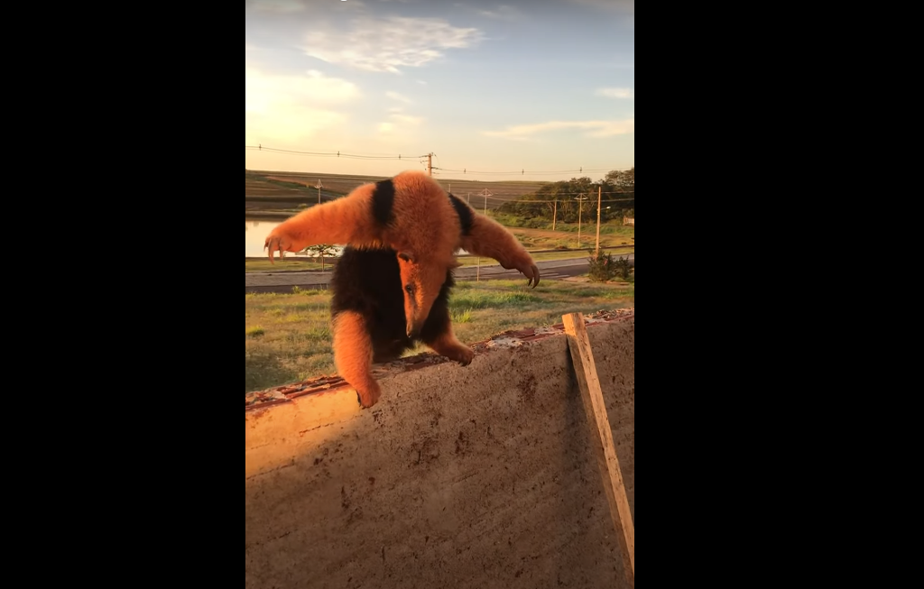 Однажды утром бразилец из городка Пекено-Параисо (муниципалитет Параизу-ду-Норти) выгуливал своих доберманов перед работой. По пути им попался одиноко сидящий на ограждении неподалеку от озера четырехпалый муравьед, или тамандуа. Собаки незамедлительно проявили к зверю интерес, на что тот незамедлительно отреагировал эффектной оборонителной стойкой: поднялся на задние лапы и раскинул передние в сторону настолько широко, насколько мог. При этом муравьед издавал агрессивное шипение, готовый отразить атаку каждый раз, когда собаки приближались на опасное расстояние.
