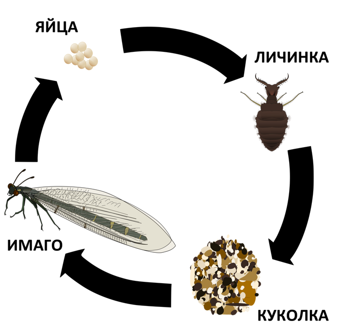 Стадия куколки длится около месяца, после чего из шарика выбирается уже взрослое крылатое насекомое (имаго). Цель этой стадии развития муравьиного льва – размножение. В основном они питаются пыльцой, или вообще ничего не едят, расходуя весь нажор, который насекомое набрало на личиночной стадии. Живут взрослые насекомые всего месяц, но иногда они протягивают и полтора. Их редко можно встретить, потому что свою активность они ведут ближе к ночи, а днем они сидят неподвижно и хорошо замаскированными.