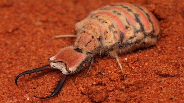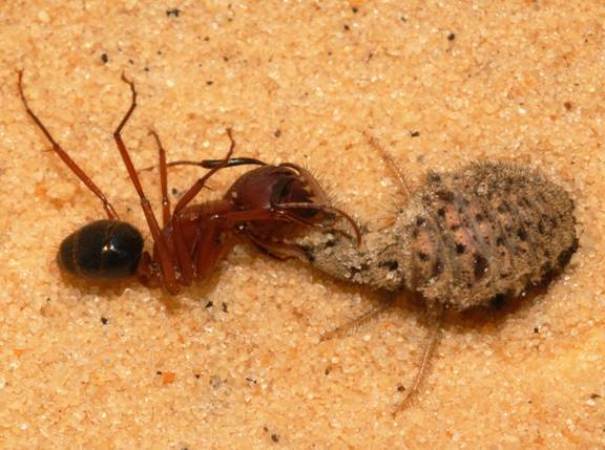 Самое интересное начинается, когда мы начинаем говорить о личинках муравьиного льва, так сказать, ради чего весь сыр-бор. Выглядит эта штуковина одновременно круто и устрашающе. Бескрылая тушка, напоминающая по форме клеща. Большая подвижная голова и раздутое брюшко. Это 40мм опасности, которая подстерегает любое более мелкое насекомое. Голова увенчана огромными серповидными челюстями с острыми шипами, которые не оставляют шансов никому, кому не посчастливилось оказаться в них. Личинка муравьиного льва вооружена мандибулами с ядом, которым она парализует своих жертв.
