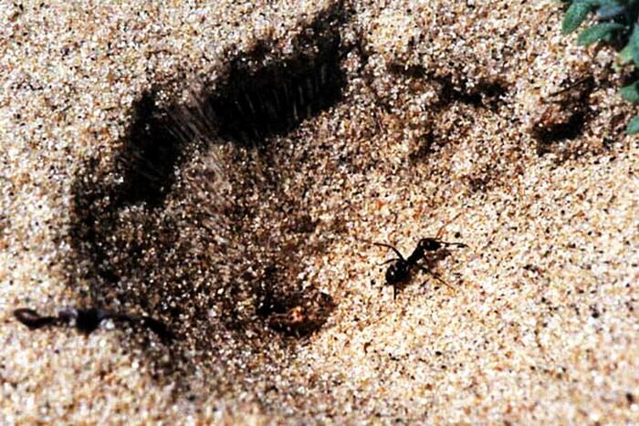 Если мимо ямки топает муравей по своим муравьиным делам, и случайно забредает на край ямы, бортик начинает осыпаться, увлекая обреченное насекомое с собой. Личинка может выбрасывать рыхлый песок со дна воронки, тем самым вызывая дополнительный оползень. Так или иначе, если жертва оказалась внутри воронки, то назад она уже не выберется и станет обедом для хищника, который притаился на дне.