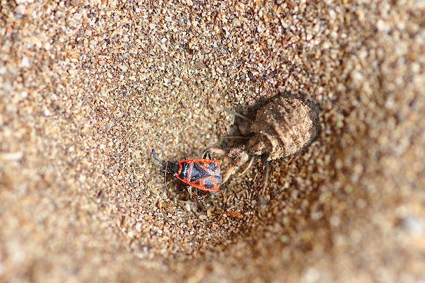 Муравьиные львы известны в первую очередь за счет своих хитрых ловушек, в которые они заманивают своих жертв. Чтобы организовать ловушку, личинка движется по кругу, выгребая песок из ямки, постепенно увеличивая ее размеры вглубь и вширь. Личинка будет копать до тех пор, пока угол наклона стенок из песка не достигнет критического угла, при котором песок начнет осыпаться при малейшем прикосновении к нему. После этого личинка зарывается в центре ямки, выставив наружу свои челюсти, и ждет, когда кто-то побежит мимо.