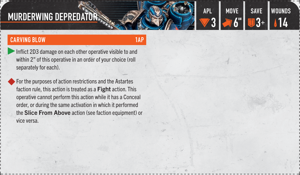 Carving Blow за 1 APL позволяет нанести всем противникам в 2" 2D3 урона. Это действие Боя, которое нельзя делать если он в Консиле или использовал Slice From Above.