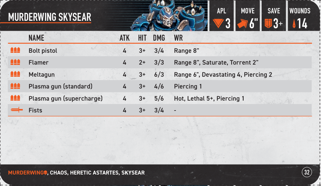Начнем с общего: это все также космические десантники со стандартными 3APL и возможностью совершить 2 одинаковых действия «Стрельба» или «Бой». Все юниты, кроме Хаос Лорда имеют 14 ран, Лорд — 15. В среднем они в 2 раза толще многих команд, если это не такой же маринад. Команда состоит их 6 слотов под оперативников и выбор из 9 опций.