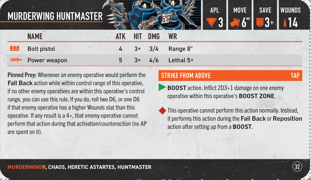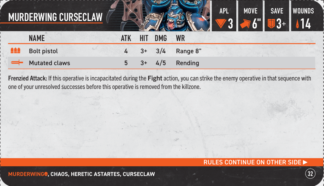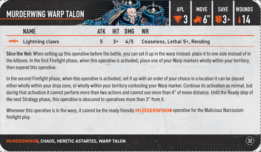 В базе экипирован Когтями. Но это не самое интересное. Его можно не выставлять при размещении. В процессе первого хода, когда доходит очередь до этого оперативника выставляется маркер Варпа на стол либо в деплое, либо на своей половине стола. А во второй ход Варп-Коготь выходит из варпа, но у него всего 2 действия и мув обрезан до 4". До следующего хода он является не валидной целью для стрелковых атак на расстоянии более 3".