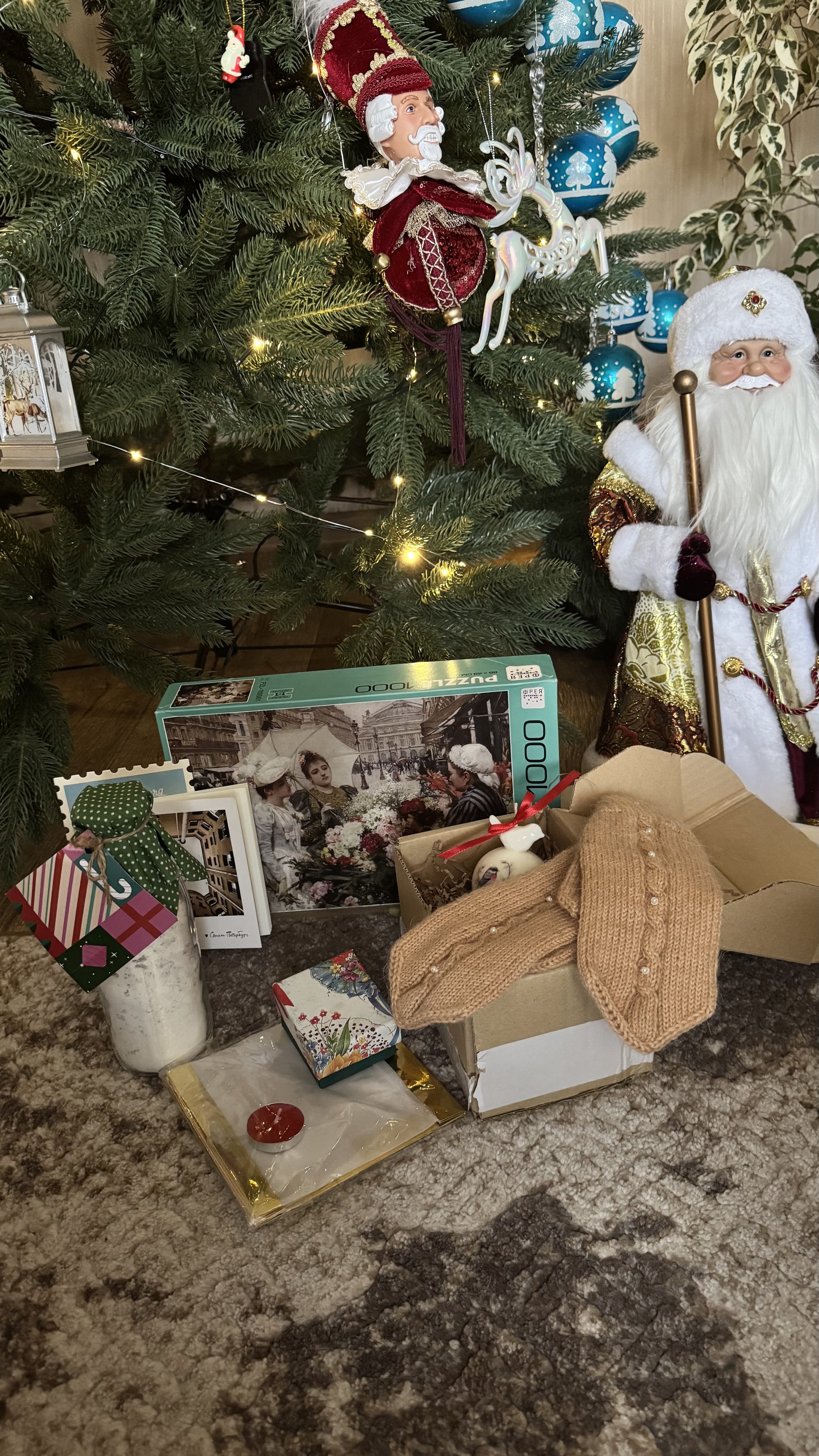Помимо милой открытки с приятными пожеланиями , я нашла очень много милых вещиц .И невероятно красивая свеча , которую очень жаль зажигать )) оставлю для любования , и смесь для приготовления печенюшек( растижопки) , пазл с красотками парижанками , очень милые варежки , Снегурочка, ты сама связала ?
