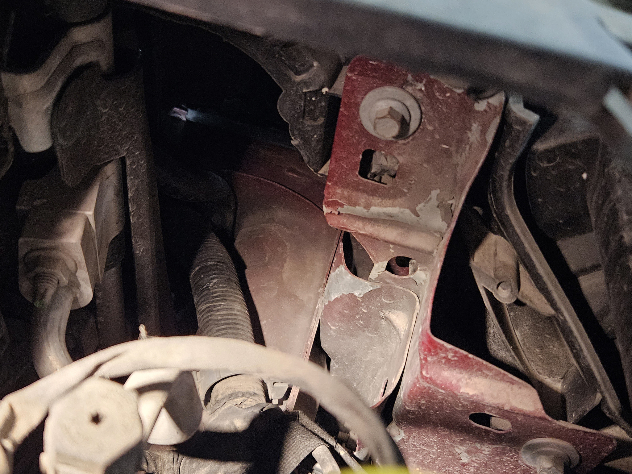 Тут мы видим следы ДТП. Мятый металл. Болты на капоте и крыльях крутились.